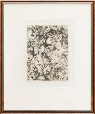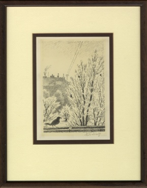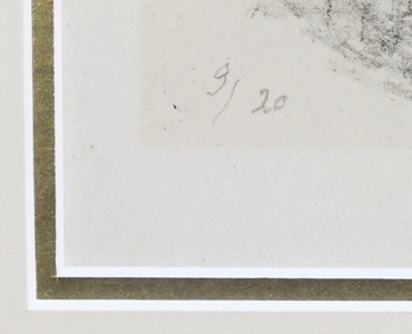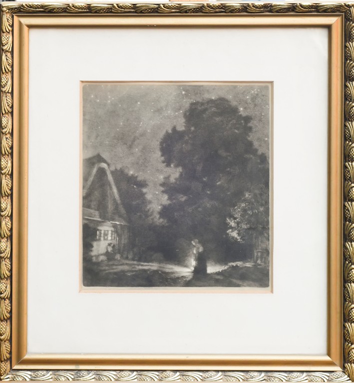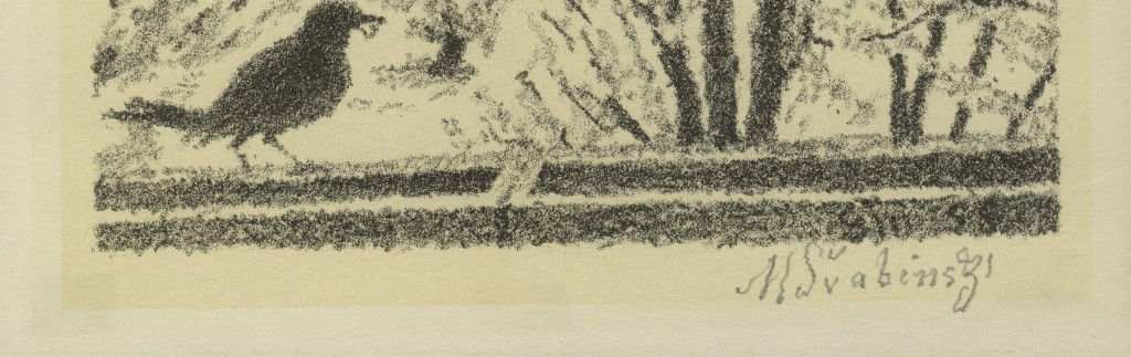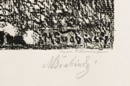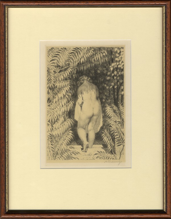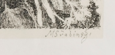 lept na ručním papíře, signováno vpravo dole tužkou M. ŠVABINSKÝ, vlevo číslováno 117/200, práce z roku 1921. Rám, sklo, list ložený na tmavém podkladu.