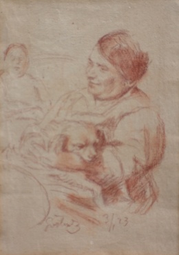 Text vzadu: Max Švabinský, paní Emilie Cirynová držící Voříška, v pozadí pí Marie Švabinská (maminka) Kresba. V Praze 9.XI 1943.