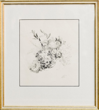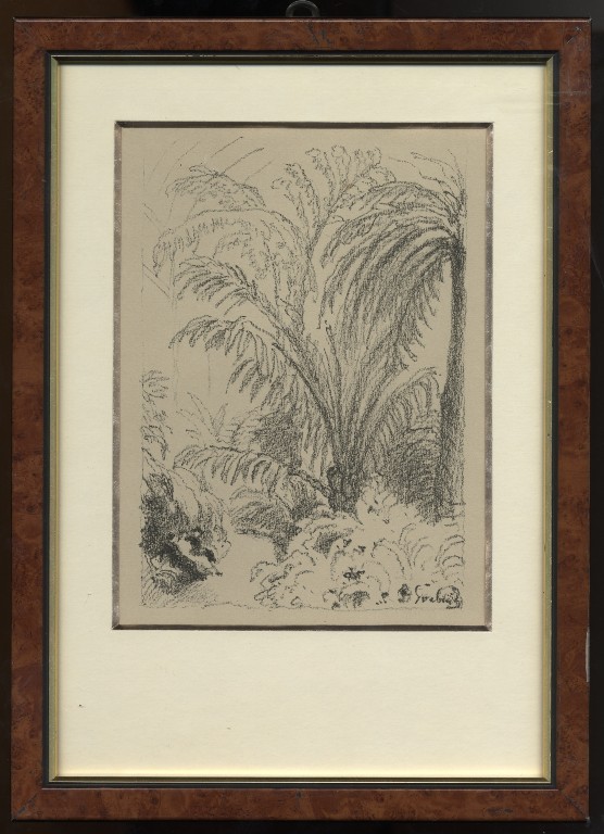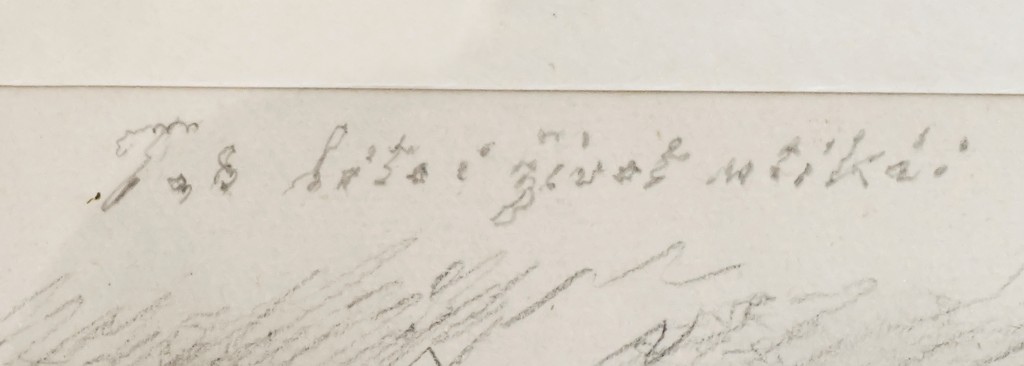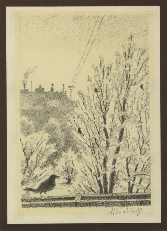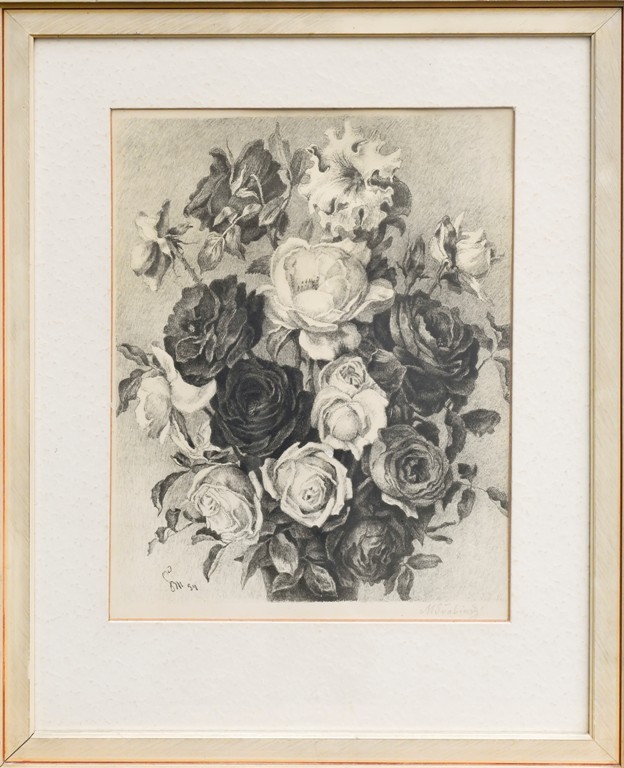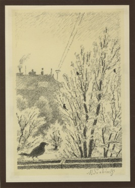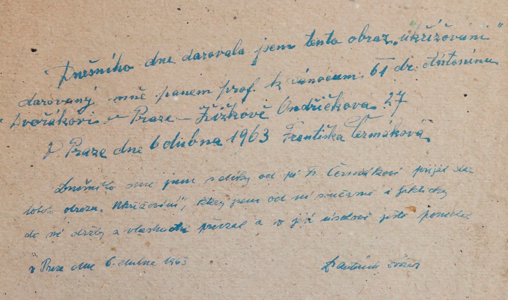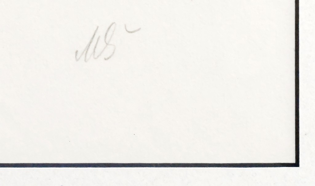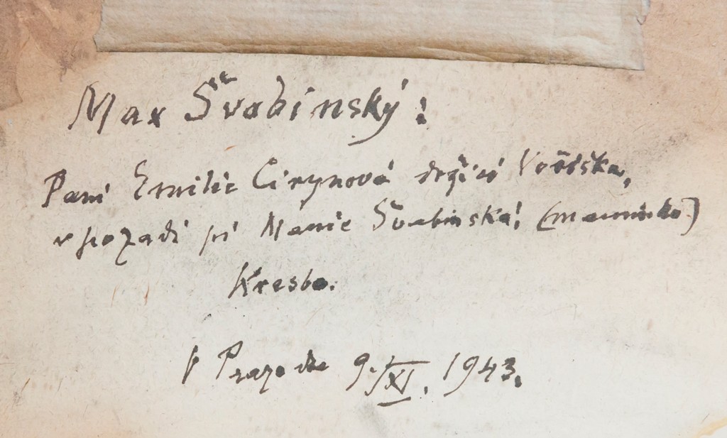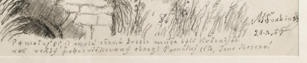 kresba tužkou, signováno vpravo dole M. ŠVABINSKÝ 28.X.58. Kresba doplněna rukou psaným textem a dedikací. Adjustováno v papírové paspartě mezi dvěma skly. V horní třetině menší hnědý flíček.
