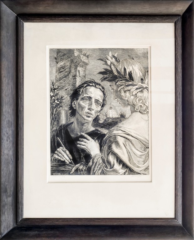 Mimořádná nabídka velmi známého a mnohokrát publikovaného listu nejen ve velké variantě a ve velmi kvalitní adjustaci, ale i provedeném vlastnoručním tiskem Mistrem Švabinským. Publikováno In: MAX ŠVABINSKÝ, Popisný seznam grafického díla 1933-1942, zpracoval A. Matějček, vydáno 1944. V sekci Stručný seznam listů z let 1897-1933 uvedeno jako č. 306 ještě pod názvem Vypravující Musa, dřevoryt. Mimo jiné publikováno In: MALÍŘ MAX ŠVABINSKÝ - DVACET PĚT OBRAZŮ S POZNÁMKAMI O DOBĚ A DÍLE, Nakladatelství ELK v Praze, 1945, obrazy vybral a studii napsal dr. Karel Herain. Citace z textu dr. Heraina:"... Když pak znovu přišel do Říma roku 1930, v době oslav dvoutisícího výročí narození básníka Vergilia, vznikl jeho "Básník a musa". List má ráz vážný a umělec přiznává, že je výrazem nové psychičnosti, obnovené spirituálnosti, ale určitěji vyjádřené než v mládí. ..."