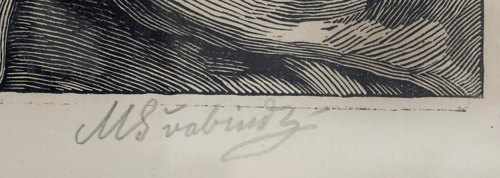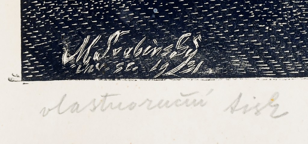 dřevoryt, signováno vpravo dole tužkou Max ŠVABINSKÝ, vlevo dole tužkou "vlastnoruční tisk" a v desce opět signatura autora a datace 1931. Luxusní ručně řezaný rám z dubového masivu, pasparta, sklo.
