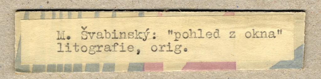 litografie, signováno vpravo dole tužkou M ŠVABINSKÝ, práce z roku 1952. Vzadu papírový štítek s informacemi o díle, text psaný na psacím stroji. Rám, pasparta, sklo.