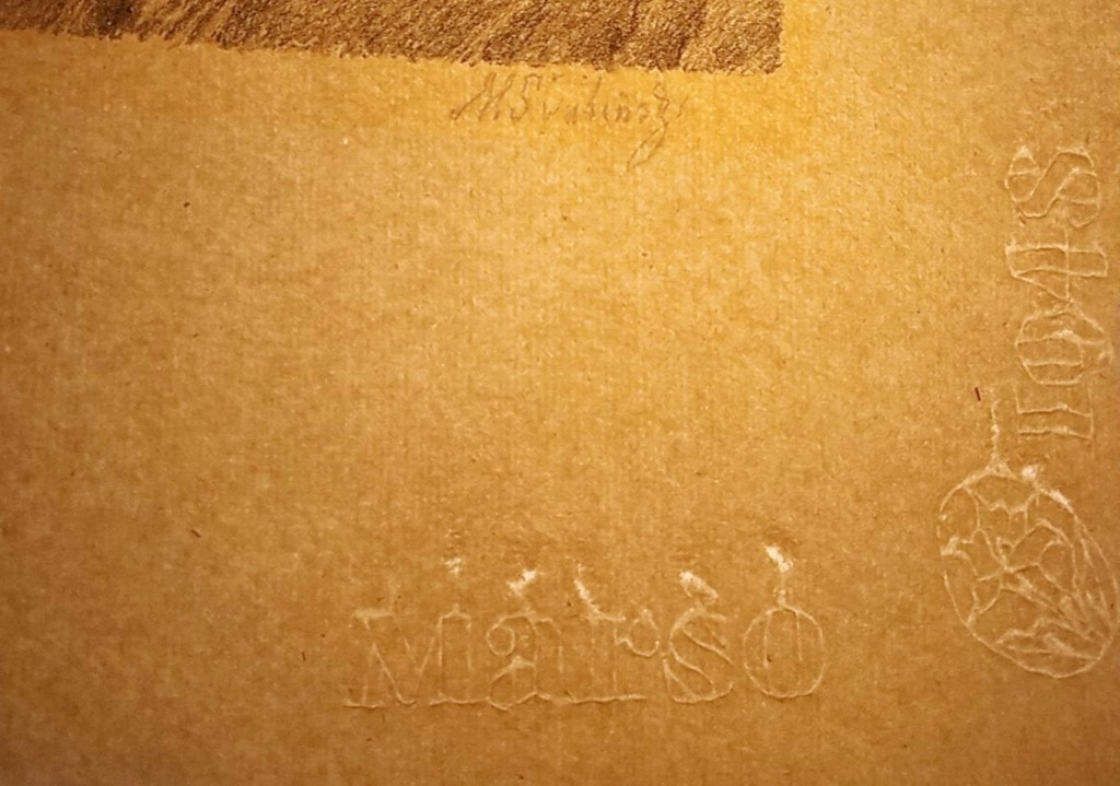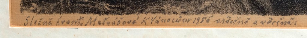 mimořádně velká litografie na kartonu vydaná k výstavě Souboru prací M. Švabinského. Datováno 1923, vydala UNIE Praha. Výstava se konala v listopadu - prosinci 1923 v Obecním domě v Praze. Dubový umělecký rám, sklo v levém horním rohu prasklé. Ručně řezaný rám je z dubového masívu, jeho cenu na dnešním trhu odhadujeme na cca 15 000 Kč.