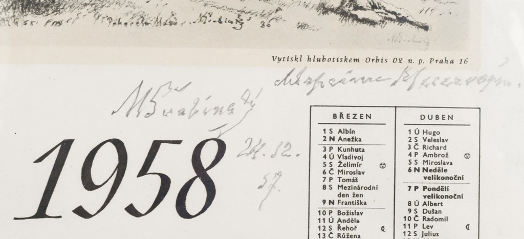 hlubotisk, signováno tužkou M ŠVABINSKÝ, datováno 24.12.1957, pod obrazovou částí je rukou psaná dedikace. Vytiskl Orbis 02 n.p. Praha 16. Rám, sklo.