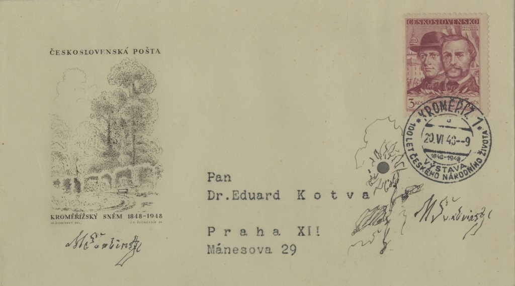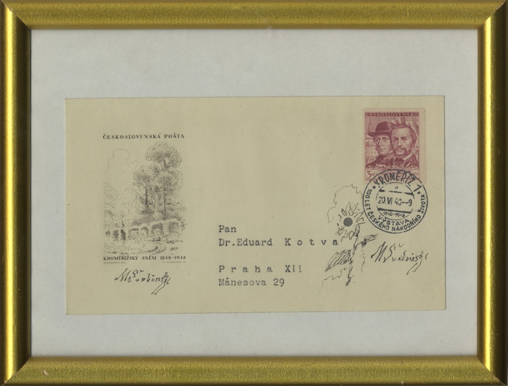 obálka odeslaná z Kroměříže na adresu: Pan Dr. Eduard Kotva, Praha XII, Mánesova 29, doplněná kresbičkou černým inkoustem a dvěma podpisy M. Švabinského. Rám, sklo.
