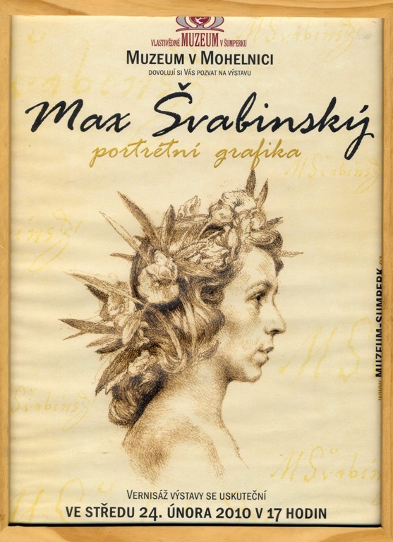 ofset. Plakát k výstavě "Max Švabinský, portrétní grafika." Vernisáž se uskutečnila 24. února 2010 v Muzeu v Mohelnici. Rám, sklo.