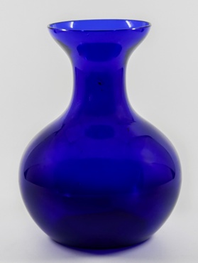 sklo indigově modré, baňka, projmuté hrdlo, druhá polovina 20. století.