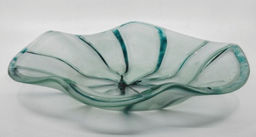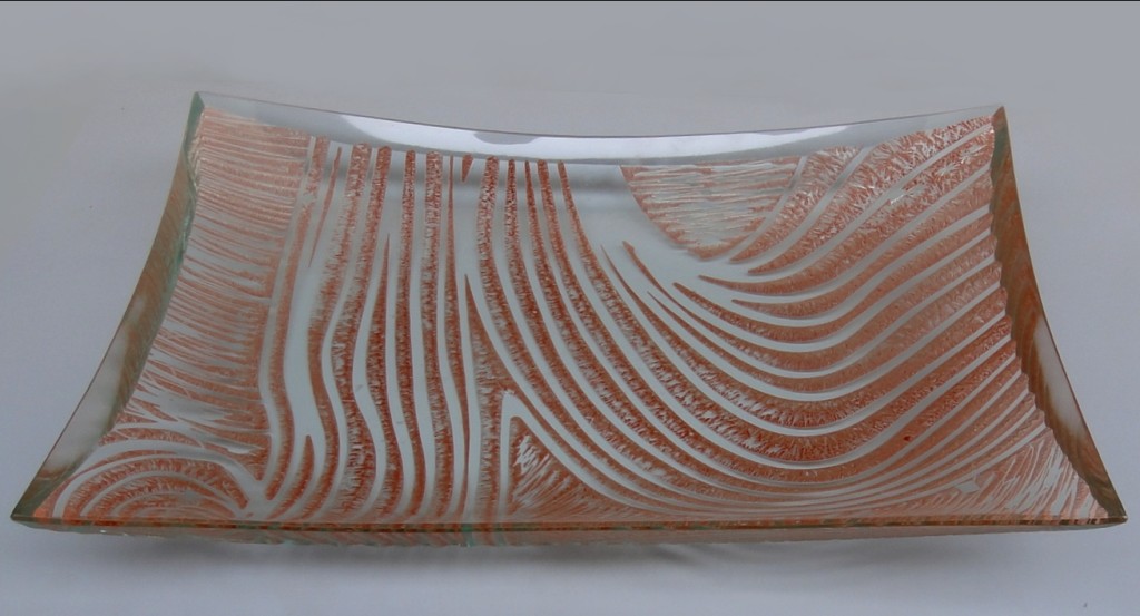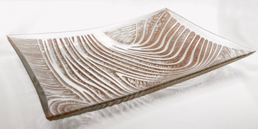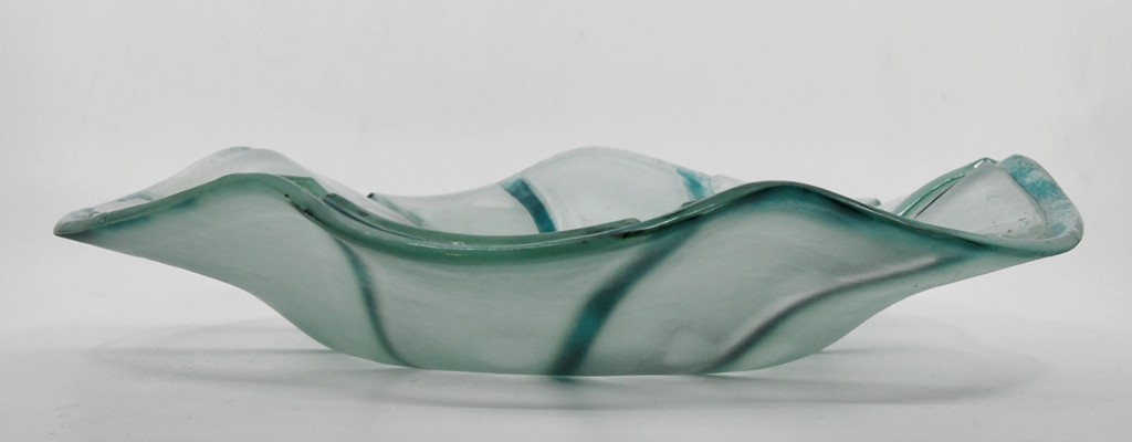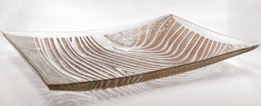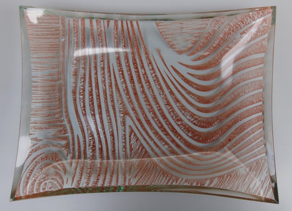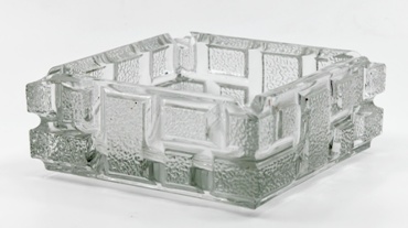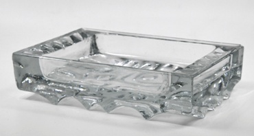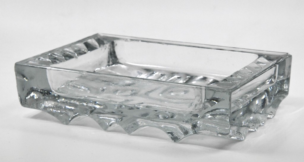 sklo silnostěnné čiré, fasetované s hloubkovým plastickým dekorem evokujícím pruhy zebry. Tvarově mělká, "obdélníková".