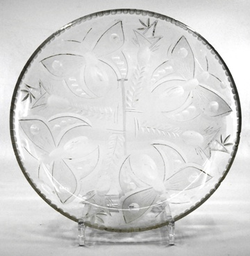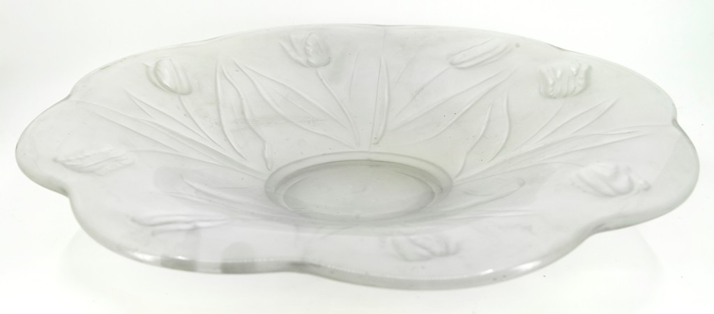 sklo bezbarvé, lisované, matované, obloučkový okraj, po obvodu reliéfní dekor tulipánů, model č. 725, Čechy, Sklárny a rafinerie Josef Inwald Praha (Praha-Zlíchov - do 1933; Dubí u Teplic - Rudolfova huť), 30. léta 20. stol.