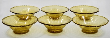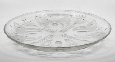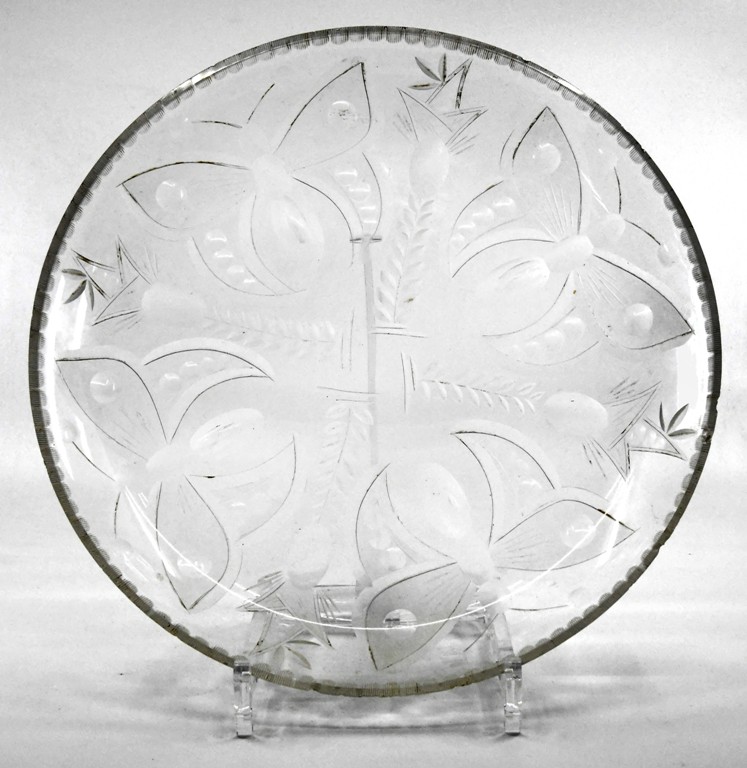 sklo čiré, bezbarvé, po obvodu broušené motivy motýlů a rostlin, první polovina 20. století. Při okraji více oklepů.
