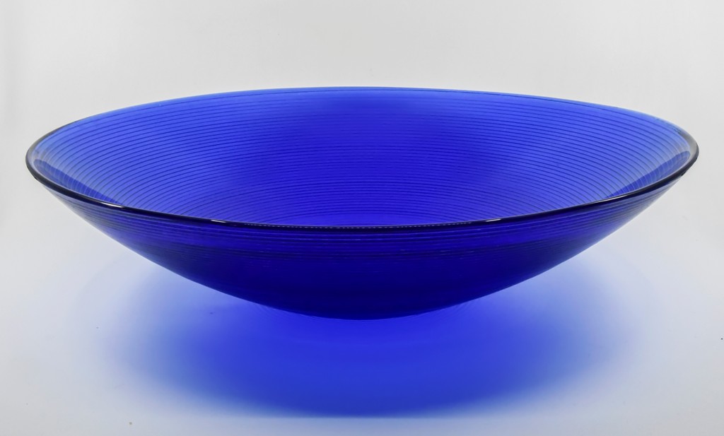 sklo indigově modré, celá vnější stěna zdobená horizontálně jemným žebrováním. Návrh JIŘÍ ŠUHÁJEK, druhá polovina 20. století.