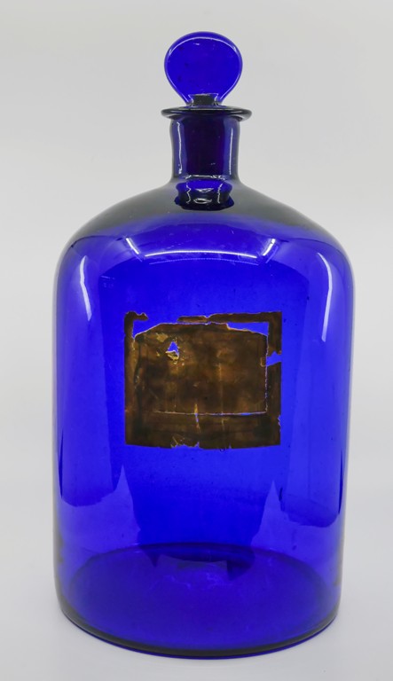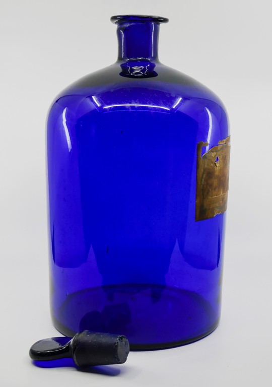 sklo indigově modré, zabroušená zátka, patrné zbytky papírového lékárenského štítku, první polovina 20. století. Na spodní hraně zátky drobné oklepy.