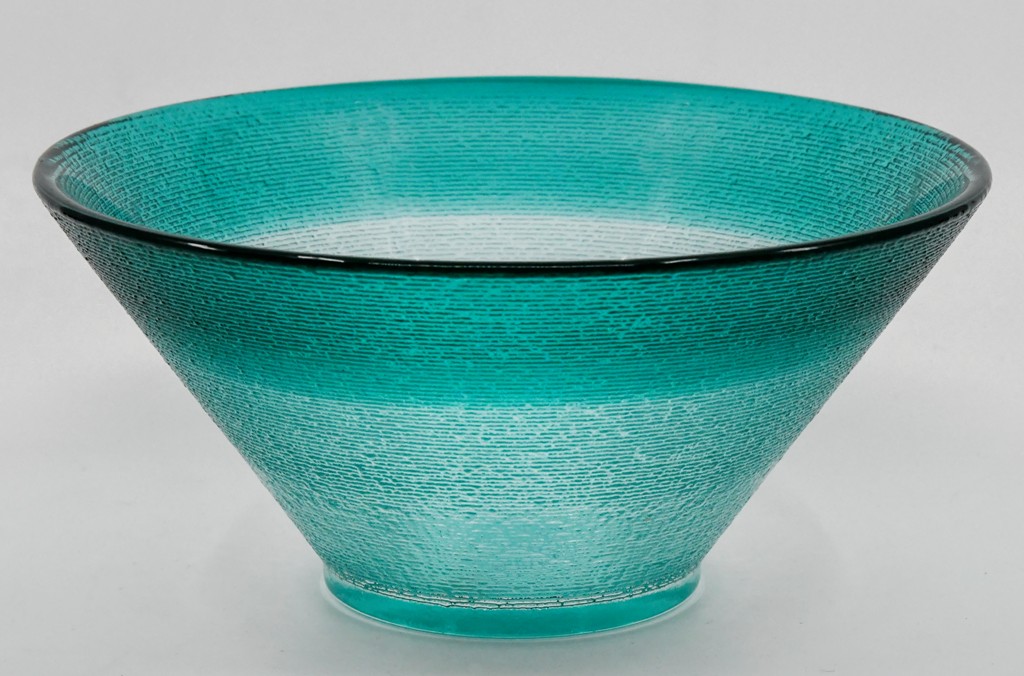 sklo hutně tvarované, nazelenalé, matné, okraj a pomyslná žebra zvýrazněny modro-zelenou lazurou. 20/21. století.