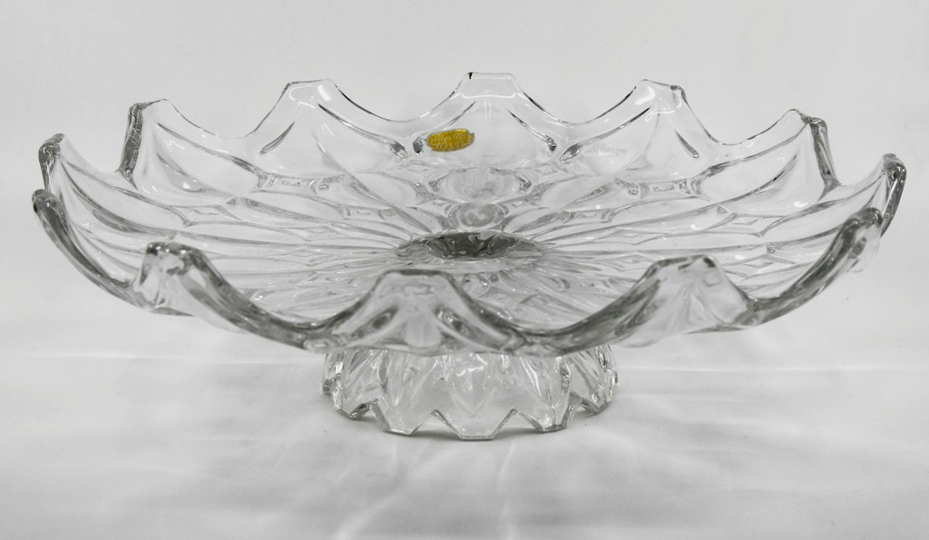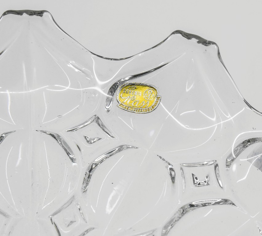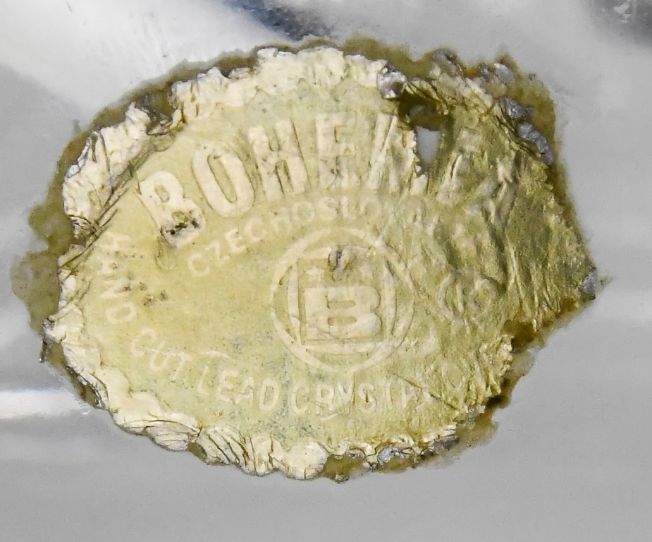 sklo křišťálové, čiré, bezbarvé, zdobené po obvodu geometrickým brusem, fragment papírového štítku Bohemia Czechoslovakia Hand Cut Lead Crystal, druhá polovina 20. století.