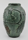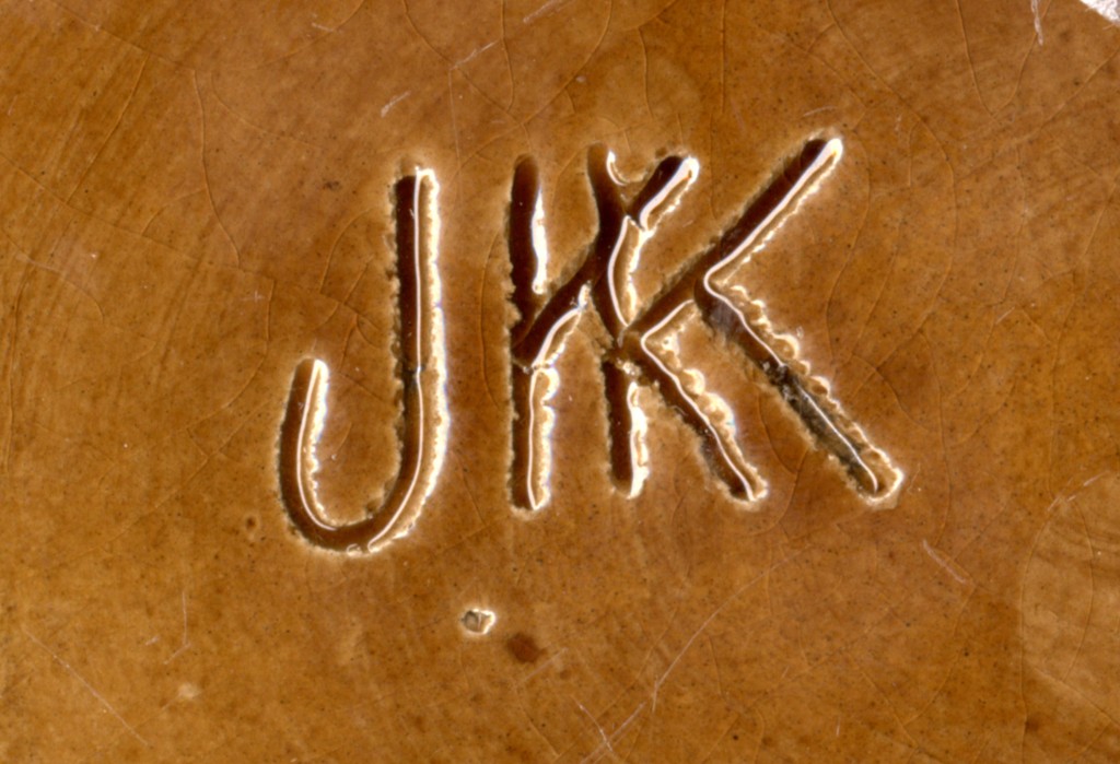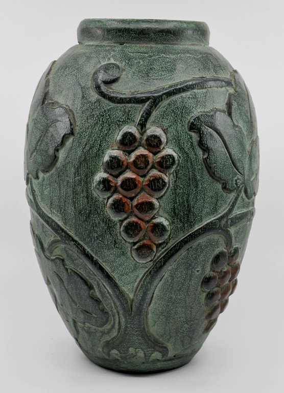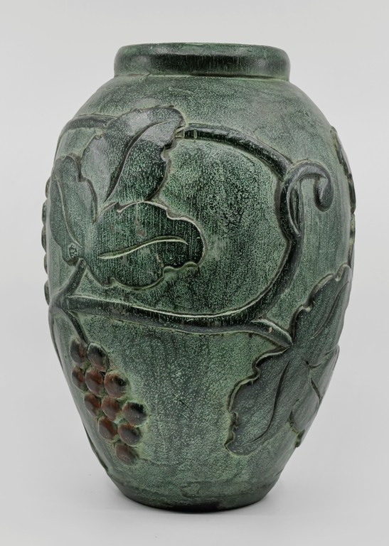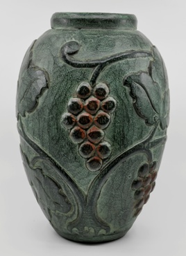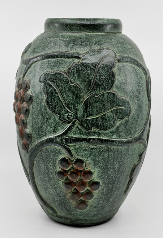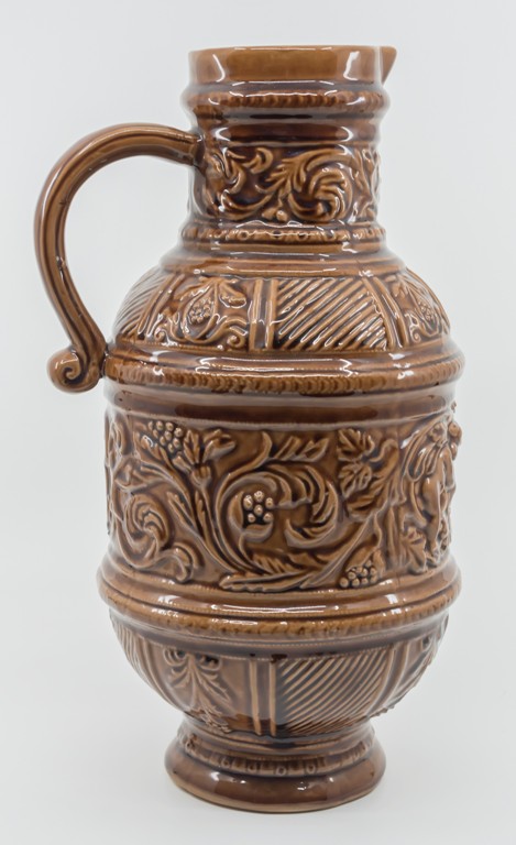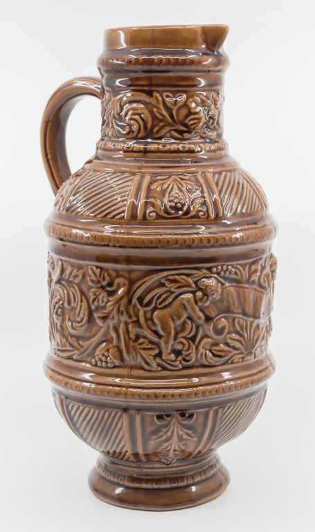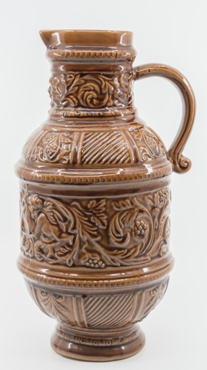 keramika hnědě glazovaná, reliéfně zdobená. Povrch rozčleněn vodorovně do pásů. V ústředním pásu putti se stuhami a rostlinné dekory, v ostatních částech se opakuje geometrický a opět rostlinný dekor. Přelom 19/20. století. Značeno vtlačeným JHK.