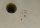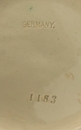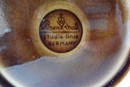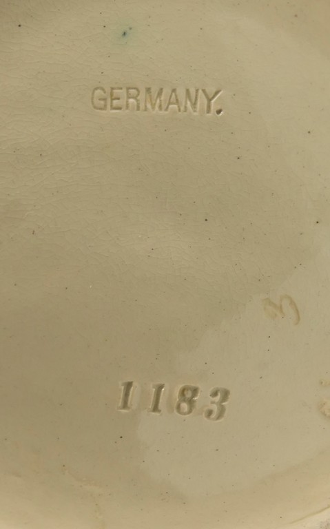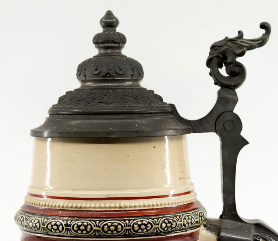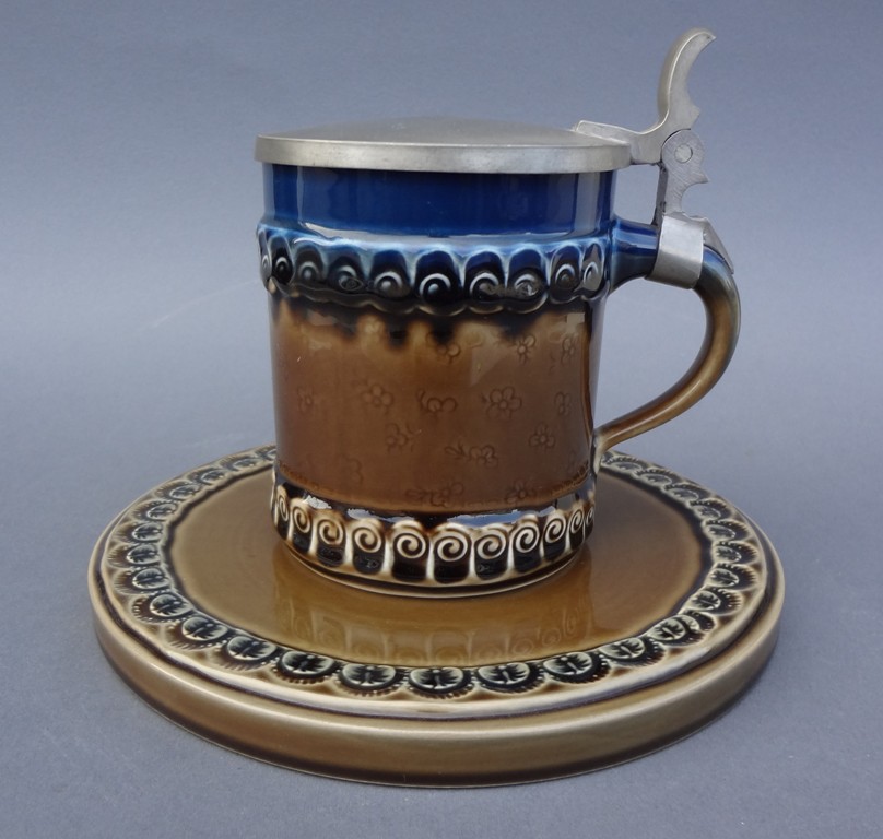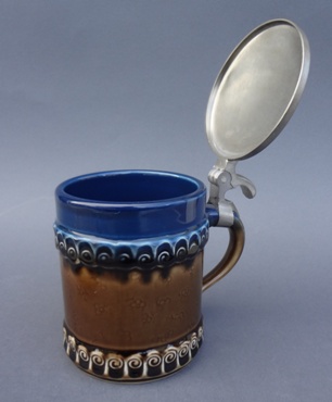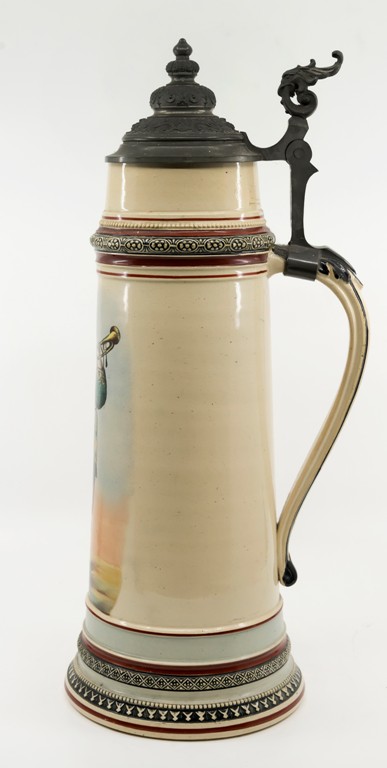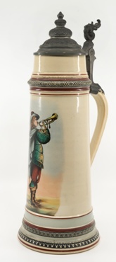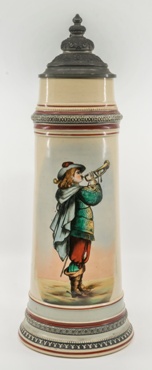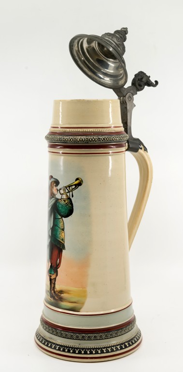 kamenina glazovaná, v centrální části barevná ruční malba muže v dobovém obleku s trumpetou. Cínové víčko zdobené plastickým rostlinným dekorem a hlavou dravce. Keramika značena vtlačeně GERMANY 1183.