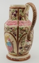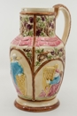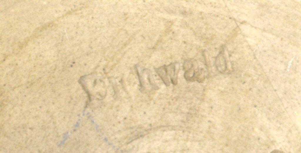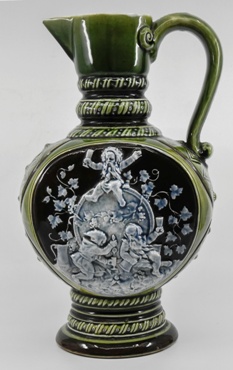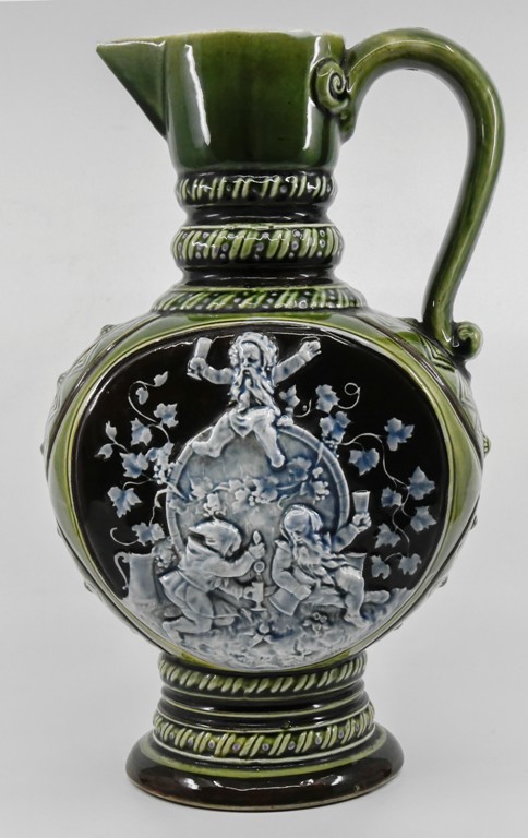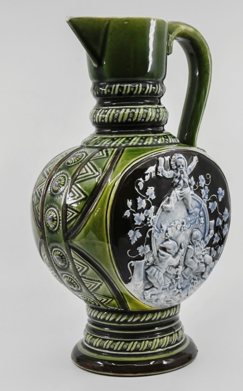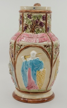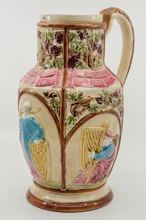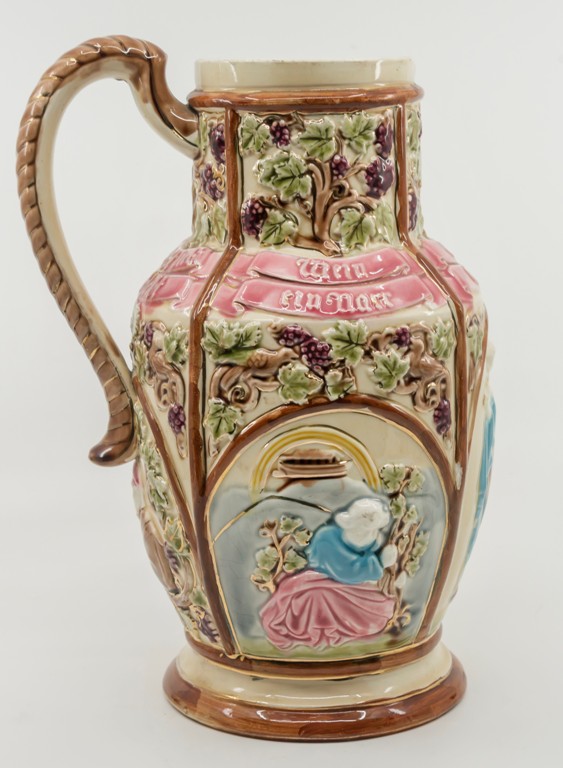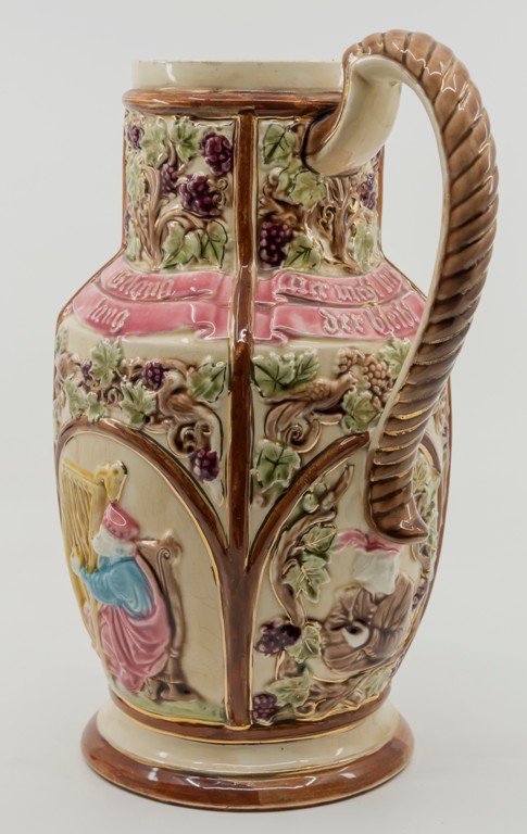 majolika barevně glazovaná, bohatý reliéfní dekor. Povrch vertikálně členěný do čtyř sektorů, v každém německý text, vinná réva a postava. Vespod vtlačená značka EICHWALD a číslo 4609, konec 19. století. Drobný oklep.