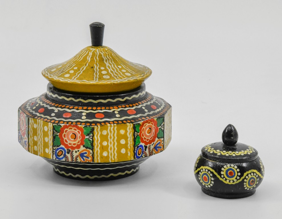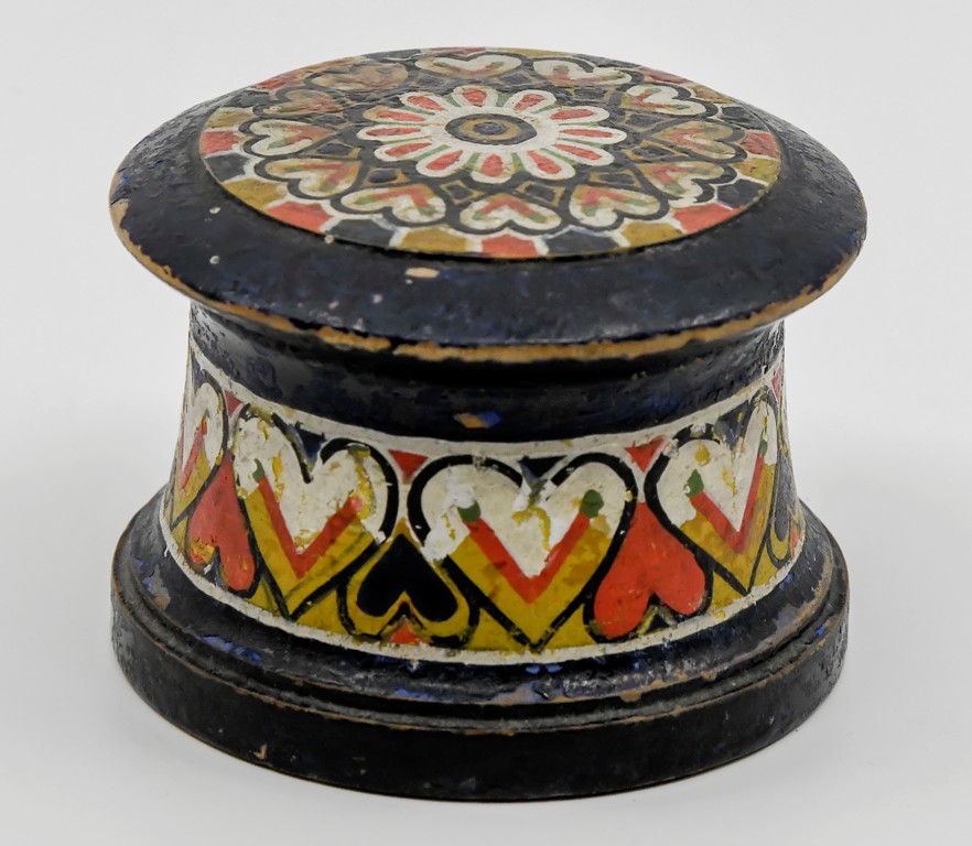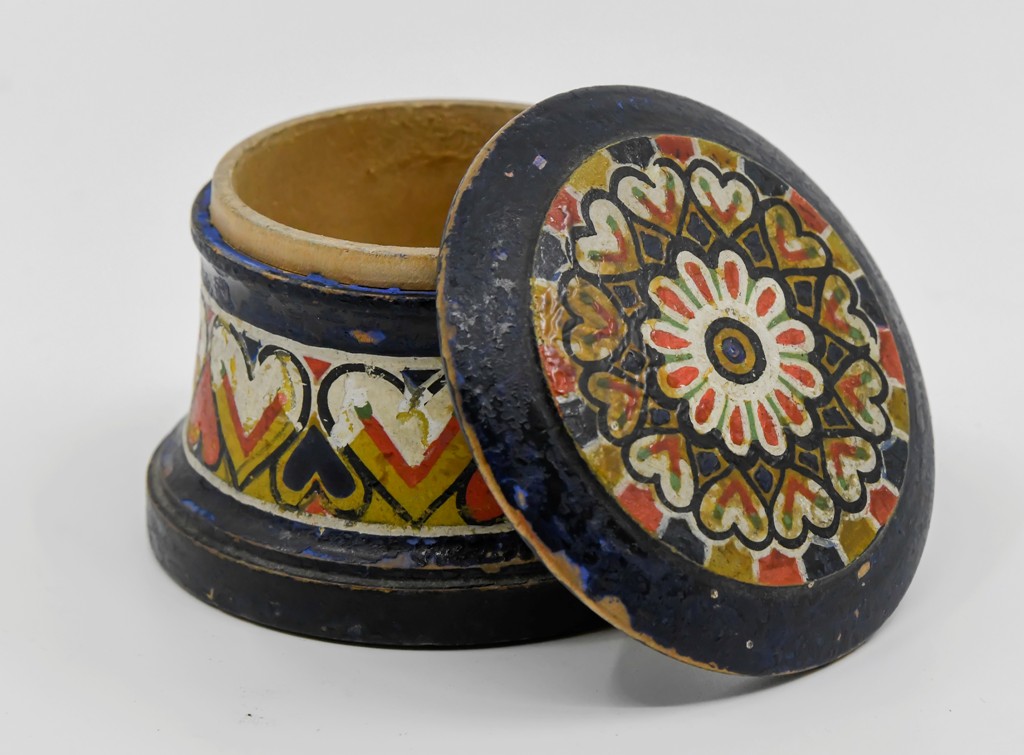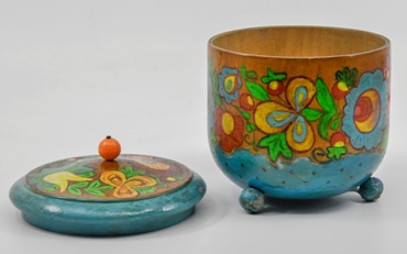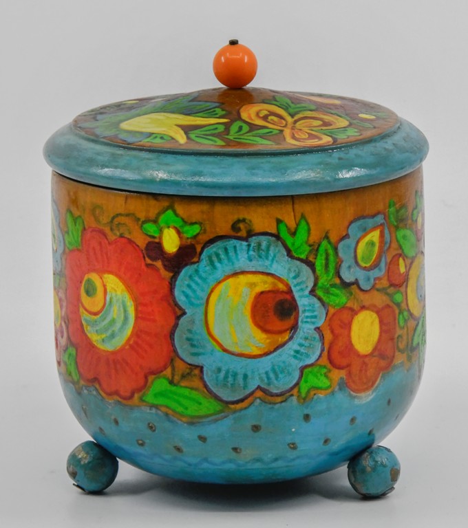 malované soustružené dřevo, stylizovaný barevný květinový dekor na tyrkysovém podkladu, na víčku úchyt z oranžového korálku. První polovina 20. století. Drobná poškozeni povrchu, spodní strana víčka pomalovaná fixou.
