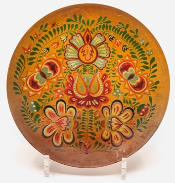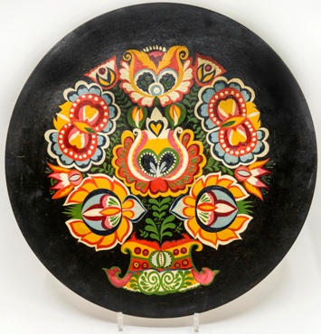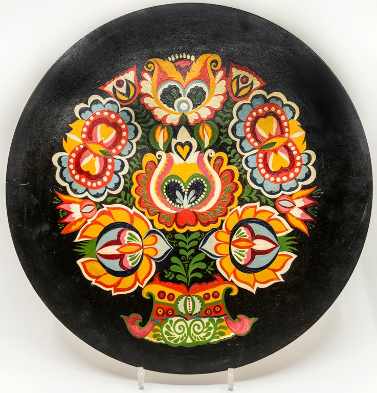 dřevěný, ručně malovaný, dekor stylizovaná kytice ve váze. Neznačeno, kolem poloviny 20. století.