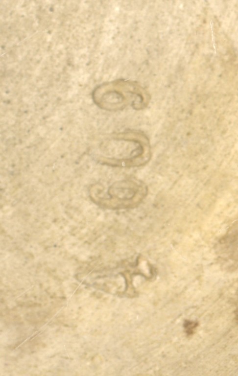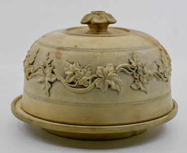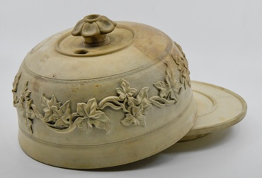 siderolit, poklop zdobený plastickým reliéfem větvičky břečťanu, ozdobný úchyt ve tvaru kytičky. Značeno na poklopu vtlačeným monogramem JM (JOHANN MARESCH) a číslem 2, přelom 19/20. století. Viditelné oklepy.