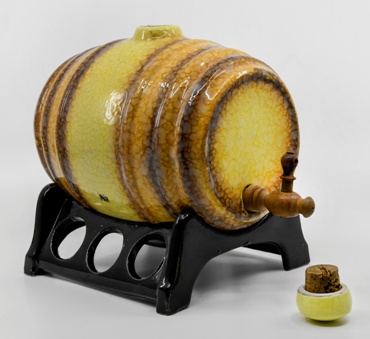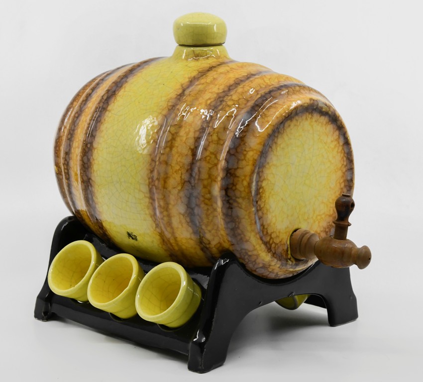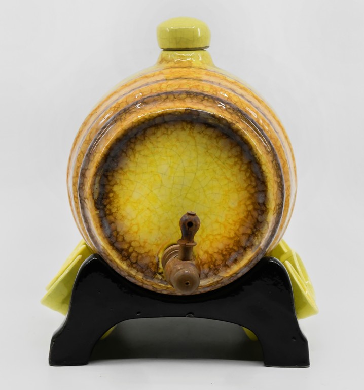 keramika barevně glazovaná, dřevěný kohoutek. Stojánek pro soudek je i stojánkem pro odlivky. Neznačeno, kolem poloviny 20. století. Dvě odlivky prasklé.