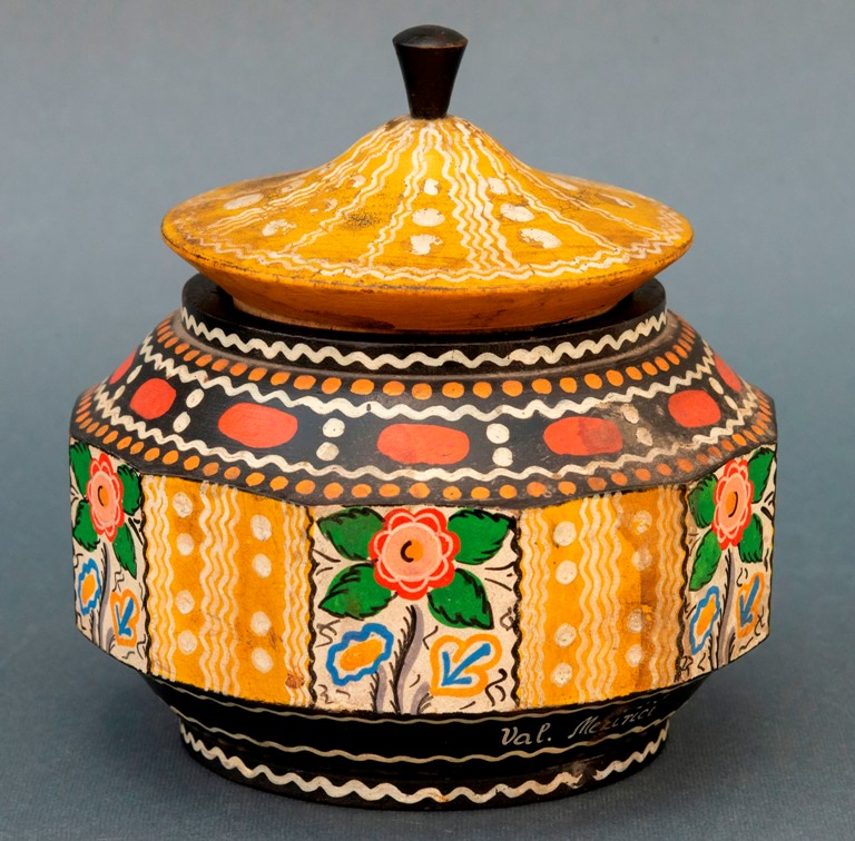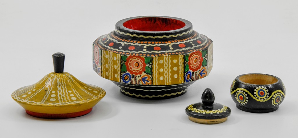 soustružené dřevo, barevně malované geometrickým a květinovým dekorem, neznačeno, první polovina 20. století.