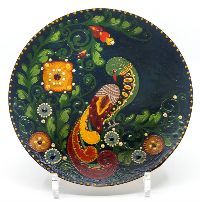 dřevěný, ručně malovaný, dekor stylizovaný motiv páva a květin. Neznačeno, kolem poloviny 20. století.