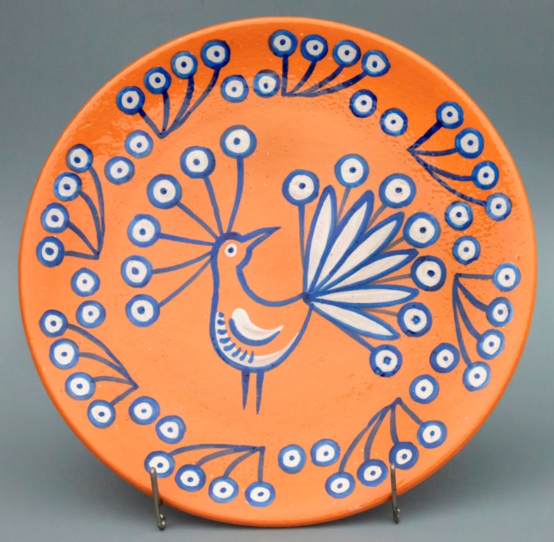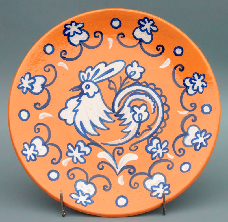 keramika hnědě glazovaná, dekor stylizovaná modrá a bílá ruční malba kohoutka a rostlinného ornamentu okolo. Neznačeno, druhá polovina 20. století.