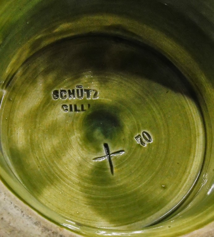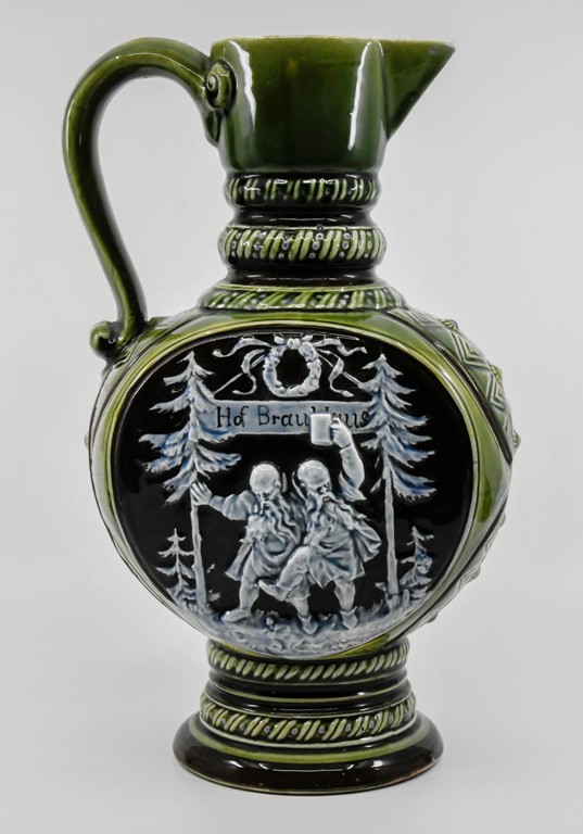 kamenina barevně glazovaná, tělo zploštělé, hrdlo zformované do výlevky. Po obou stranách reliéfní výjevy pijících trpaslíků. Značeno vtlačeně SCHÜTZ CILLI, model číslo 70, Slovinsko, výroba po roce 1890.