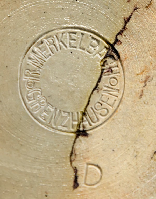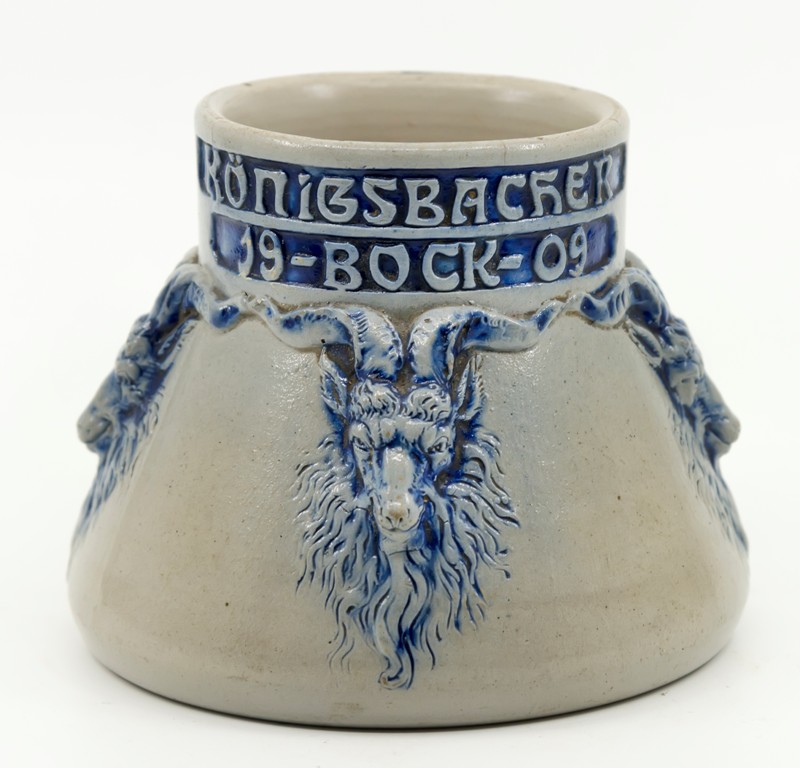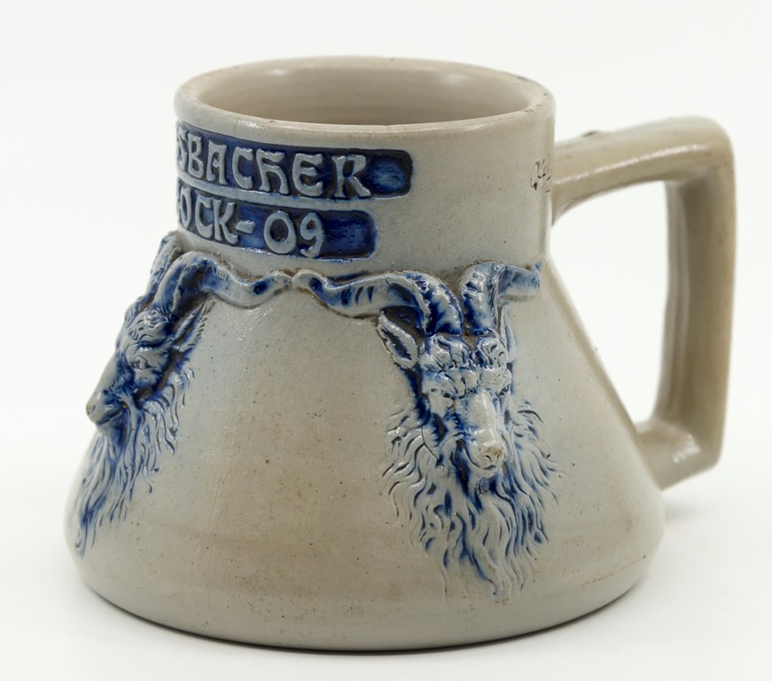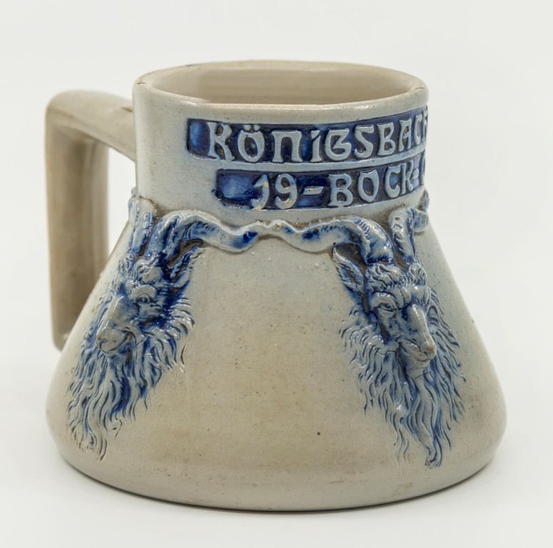 německá kamenina, kuželovité tělo, vtlačená značka R.MERKELBACH GRENZHAUSEN. Atypický tvar, šedá glazura, modrý dekor, plastický název na hrdle a hlavy kozlů propojené dlouhými rohy. U ucha vyrytá měrka 0,4 L.