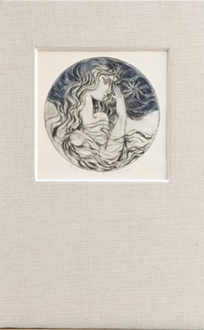 Nerámováno, fixováno jen v kruhové paspartě. Menší poškození na