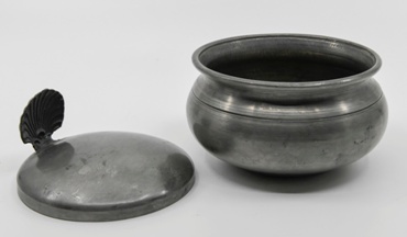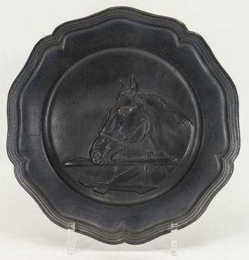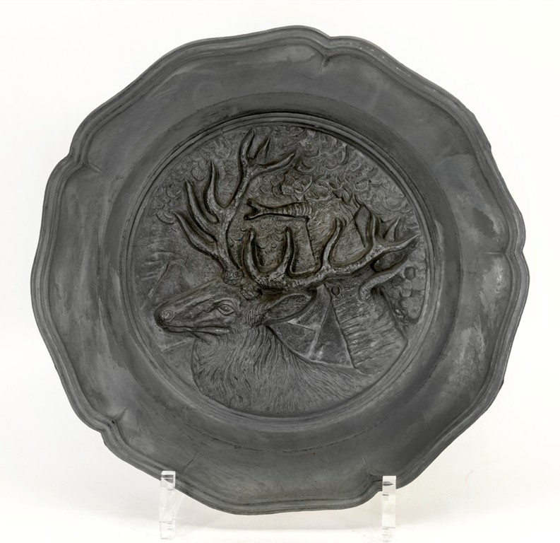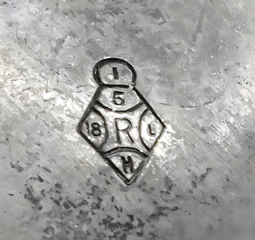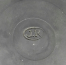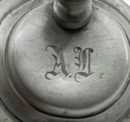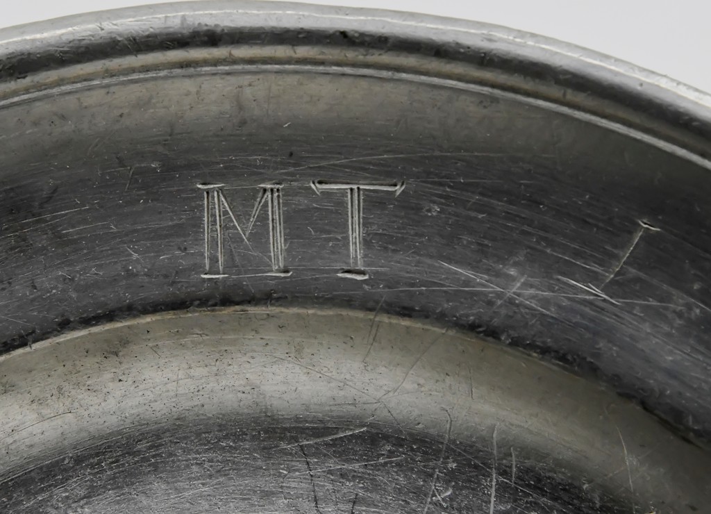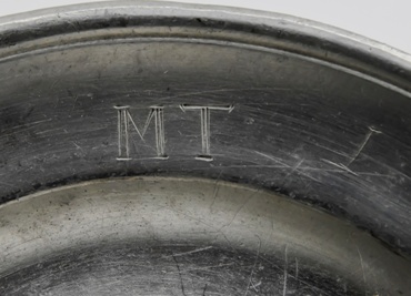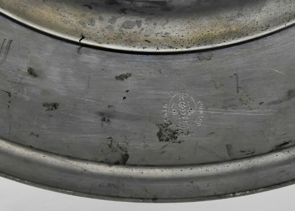 cín, tvarovaný okraj, vtlačená cínařská značka s andílkem hrajícím na trumpetu.