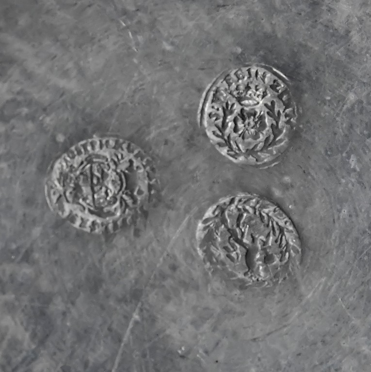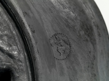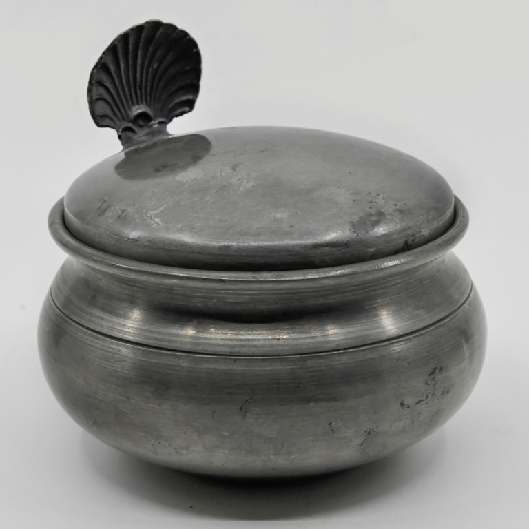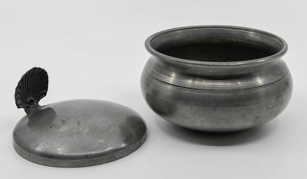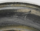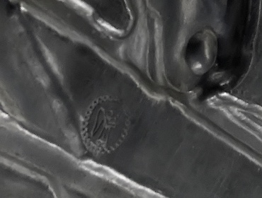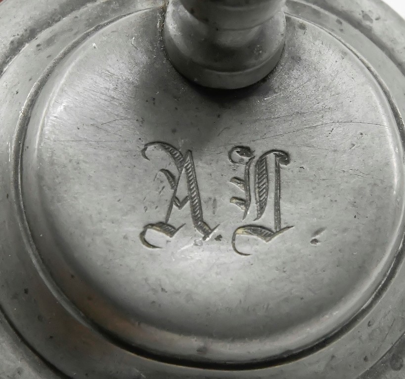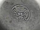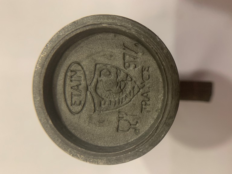cín, tvarovaný okraj, vtlačená cínařská značka s andílkem.