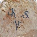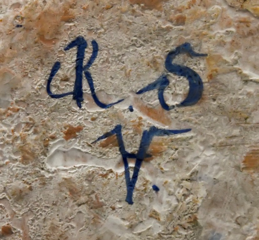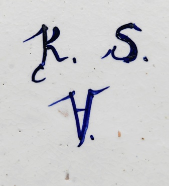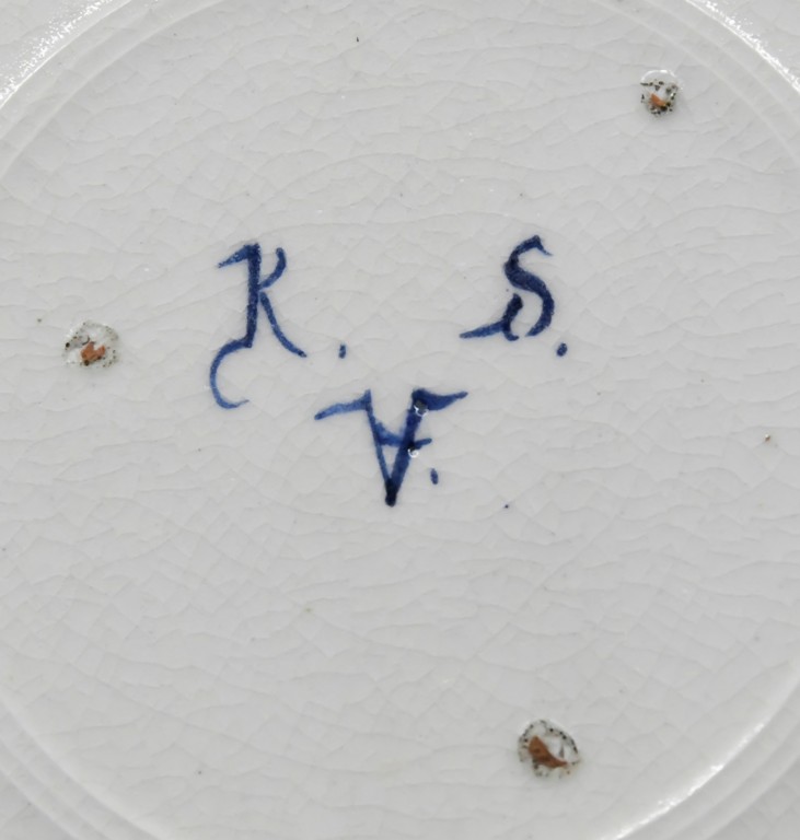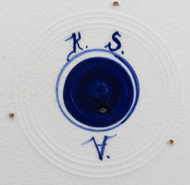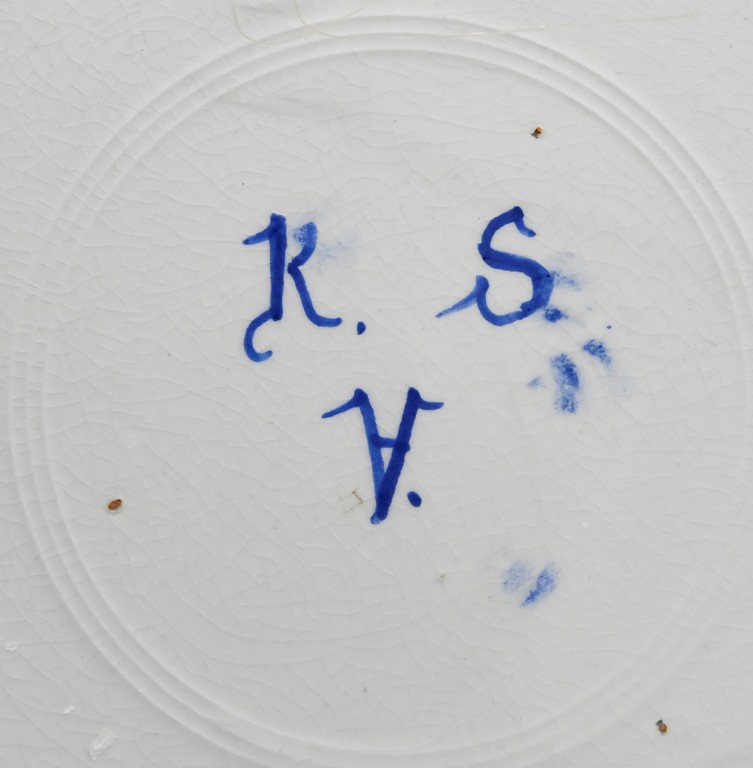 keramika bíle glazovaná, ručně malovaná modrým folklórním rostlinným dekorem. Vespod značeno monogramem K.S.V. (Karel Skalický Vyškov), první polovina minulého století.