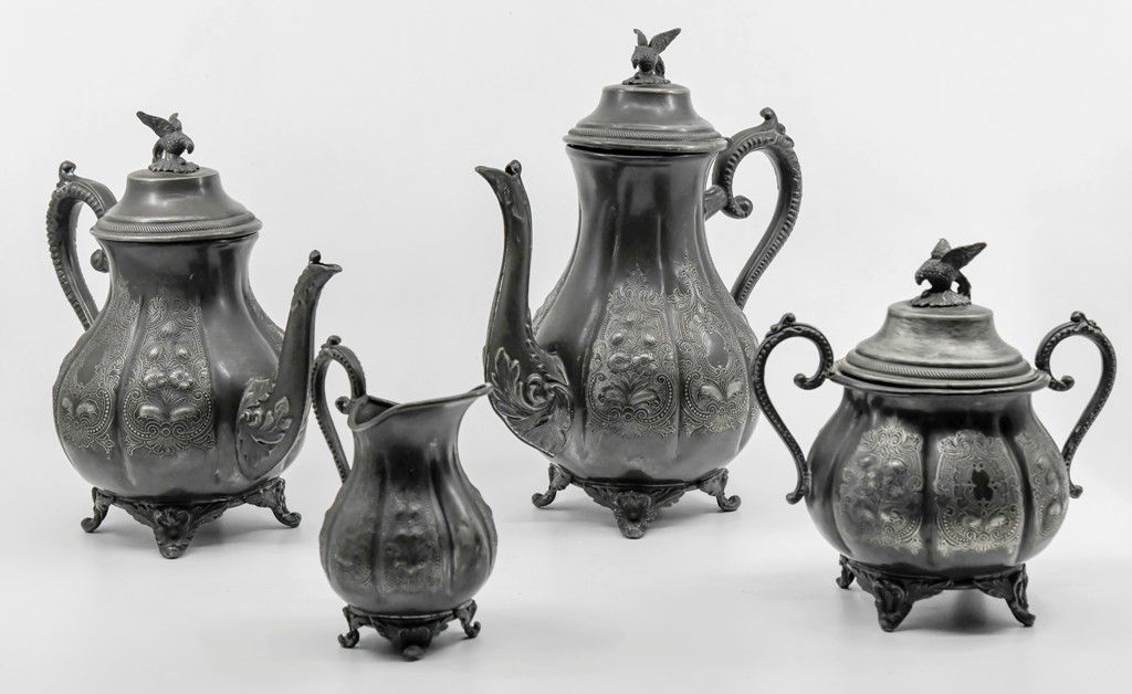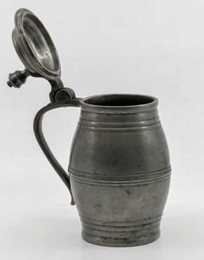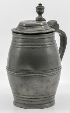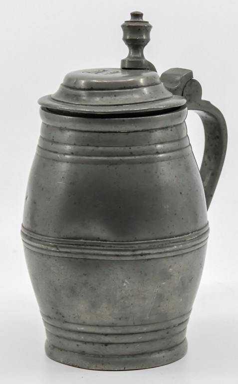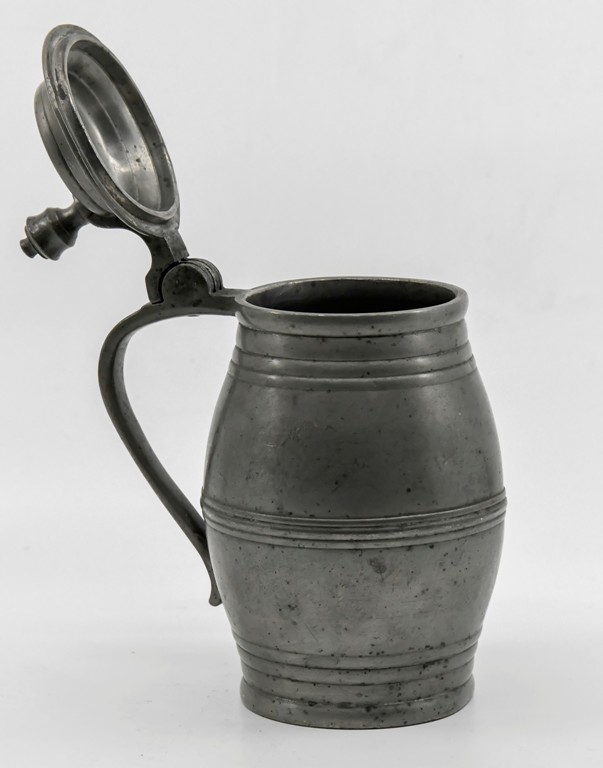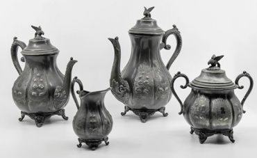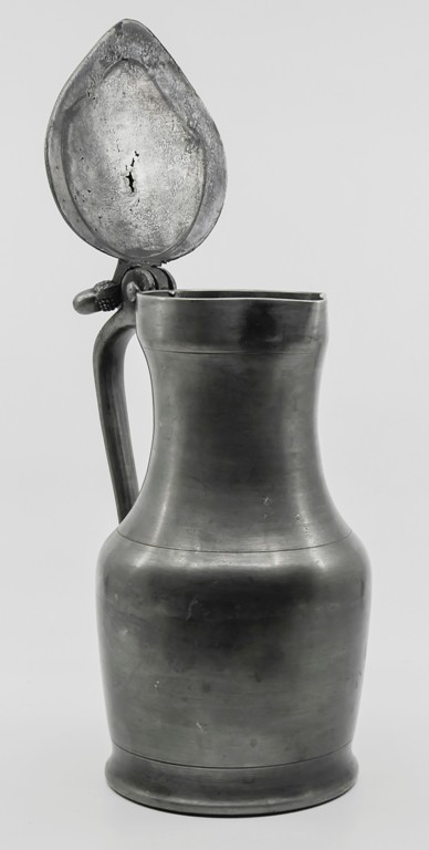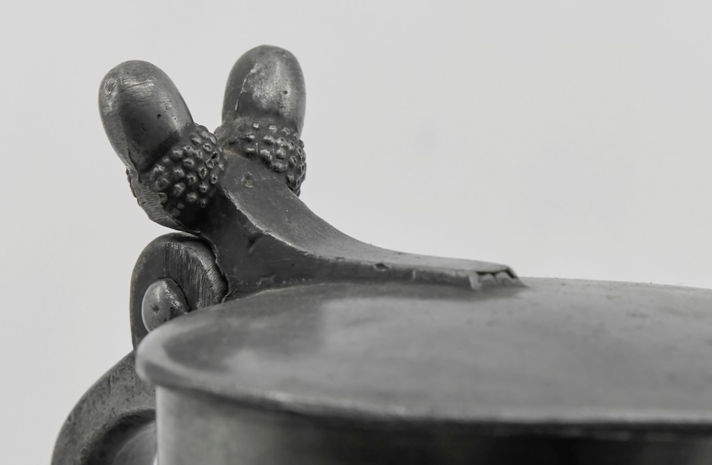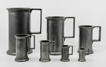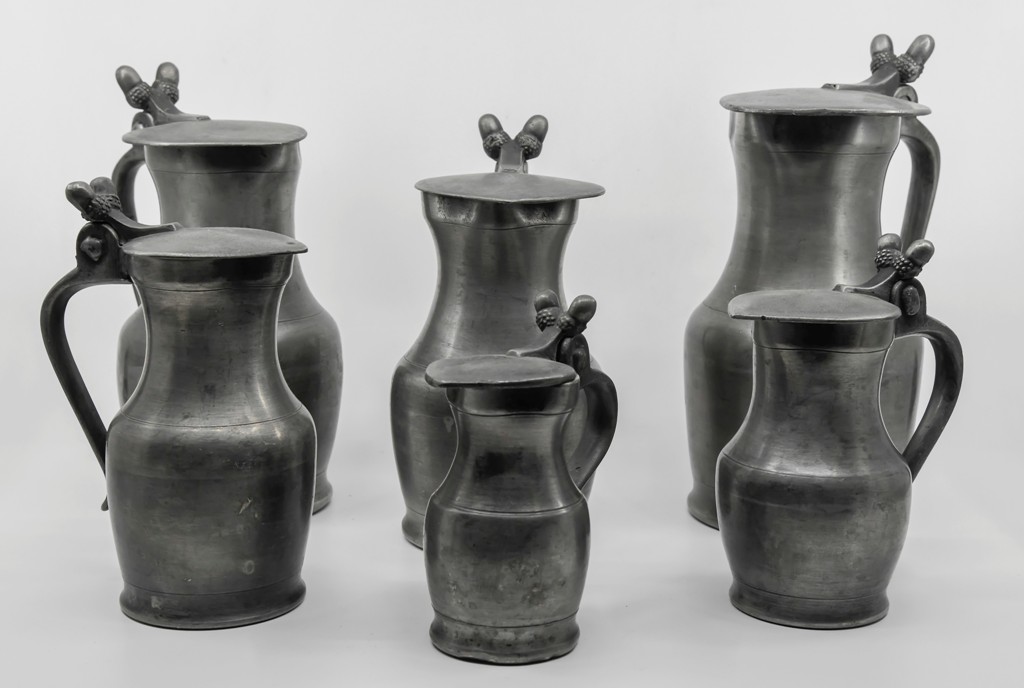 od nejmenšího 10,3 cm (výška džbánku bez víčka) až po největší 20,5 cm, na víčku vždy dekorace dvěma žaludy. Každý džbánek značen: ETAIN 95 RF (cín 95%) a kromě dvou nejmenších i puncem/značkou ve tvaru Fleur de Lys (lilie). Patrně Francie, 19 století.