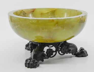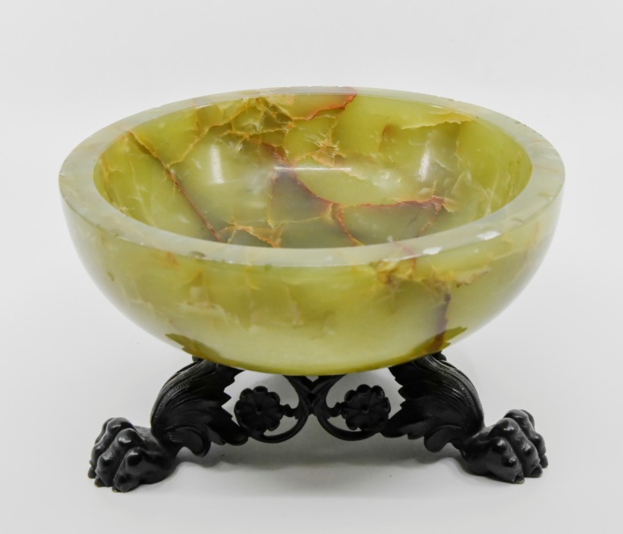 nádherný celistvý kus zeleného minerálu onyx (patrně turecké provenience), řezaného do tvaru kulaté mísy umístěné v masivní montáži. Zřejmě první polovina 20. století. Při okraji po celém obvodu více oklepů.