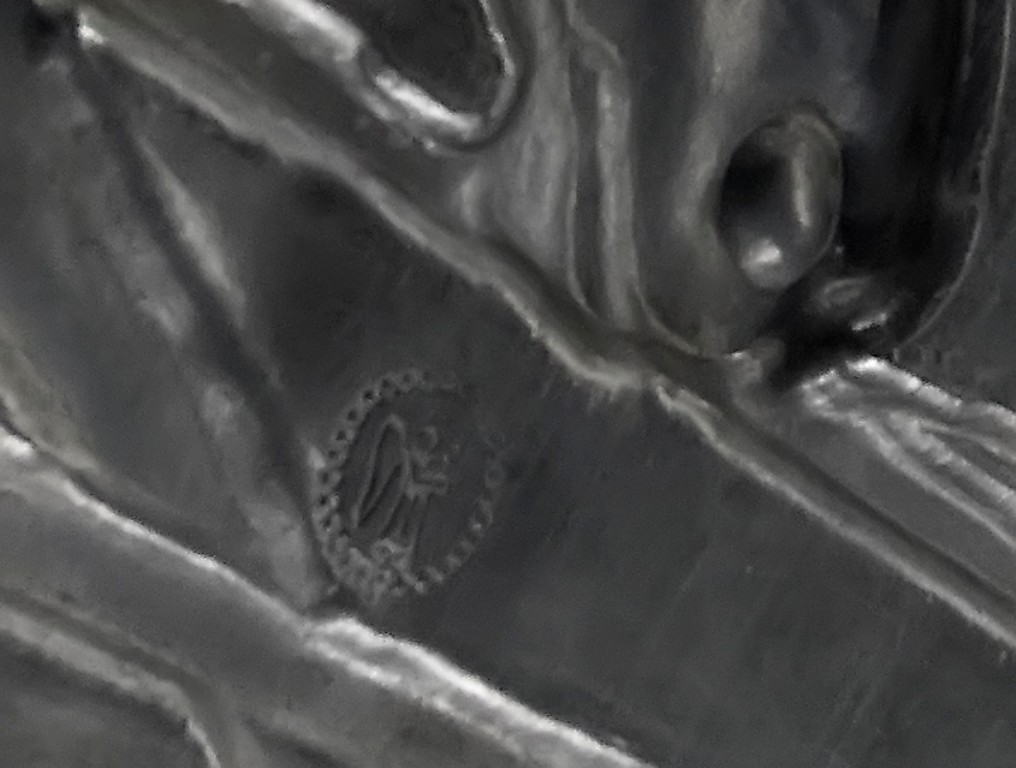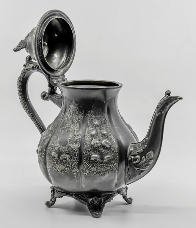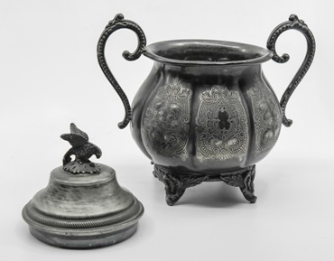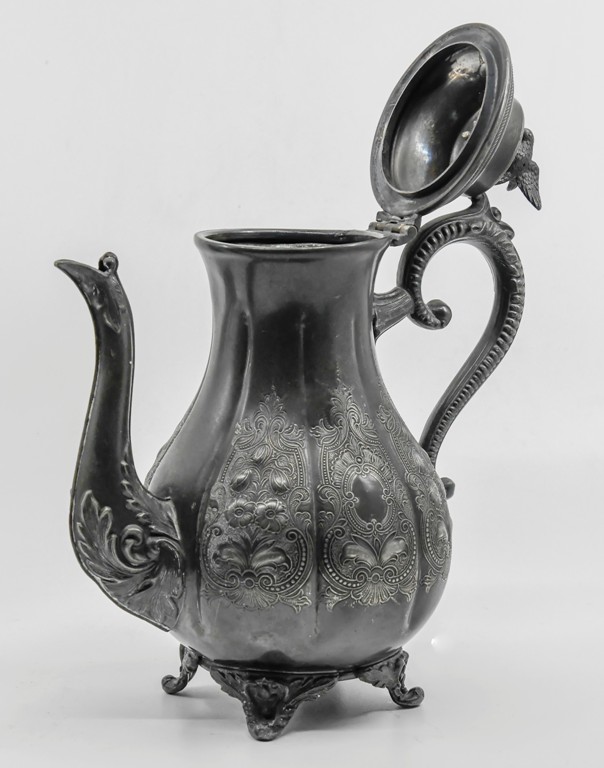 kovová kompozice s původní patinou, bohatě zdobeno jemným rokokovým rostlinným ornamentem, úchyty ve tvaru ptáčků. Značeno - Anglie, registrační značka z 5.4.1882. Několik menších poškození, zejména promáčklin.