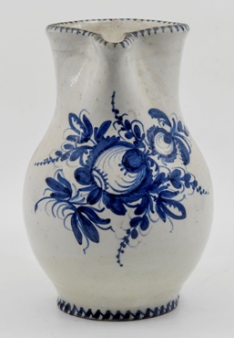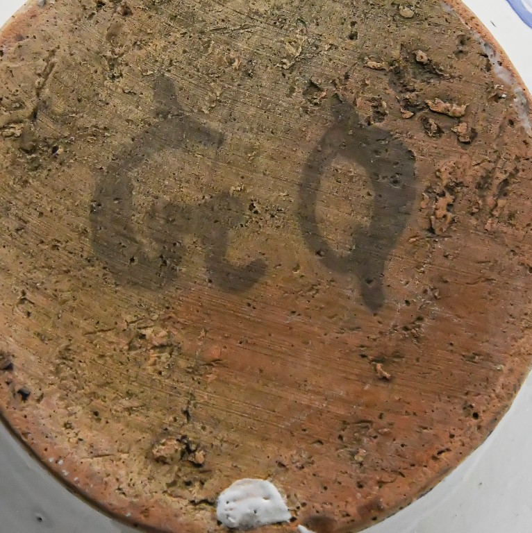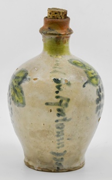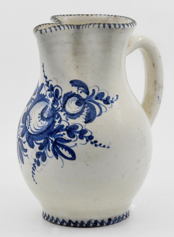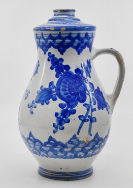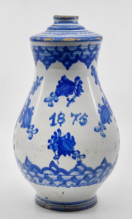 keramika bíle glazovaná, ručně malovaná modrým folklórním dekorem, datováno 1875, vespod značeno stylizovaným monogramem. Patrné praskliny v těle nádoby, na více místech poškozena glazura, drobné oklepy při okrajích.