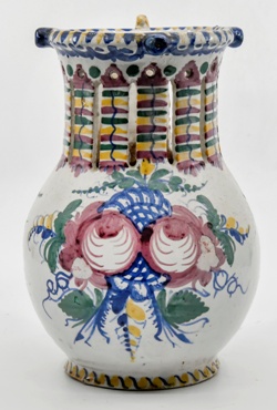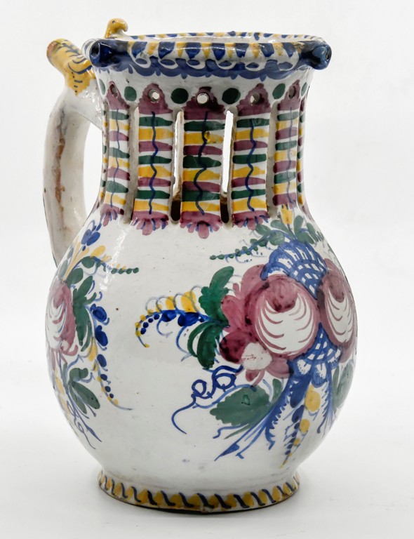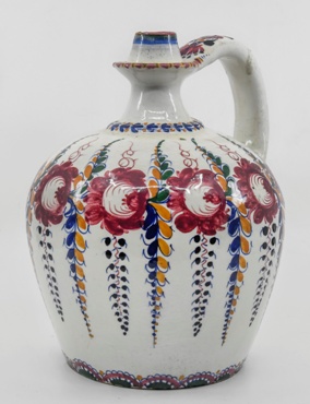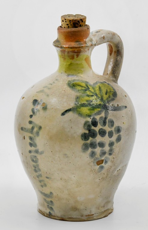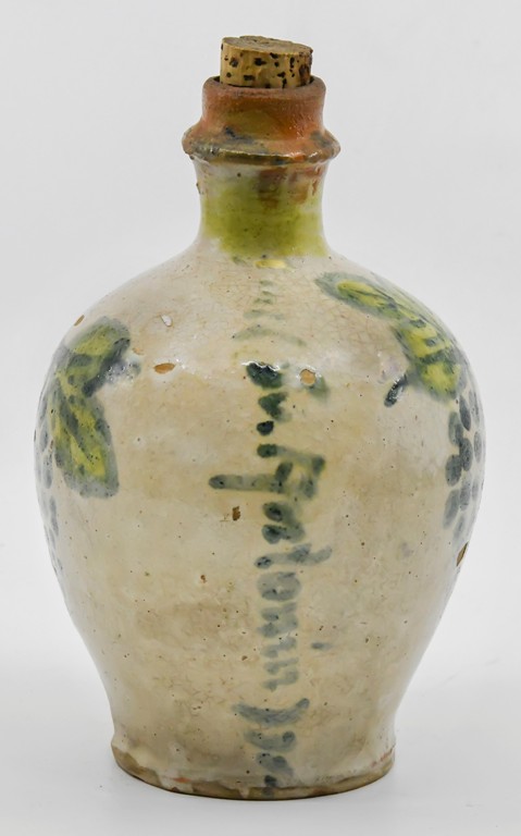 keramika bíle glazovaná, zdobená ruční malbou folklórního rostlinného dekoru. Hrdlo prořezávané. Značeno monogramem K.S.V. (KAREL SKALICKÝ VYŠKOV). První polovina 20. století. Na několika místech výraznější poškození glazury.