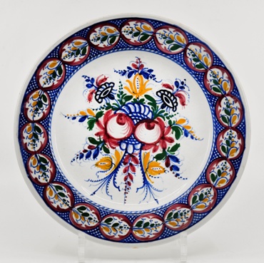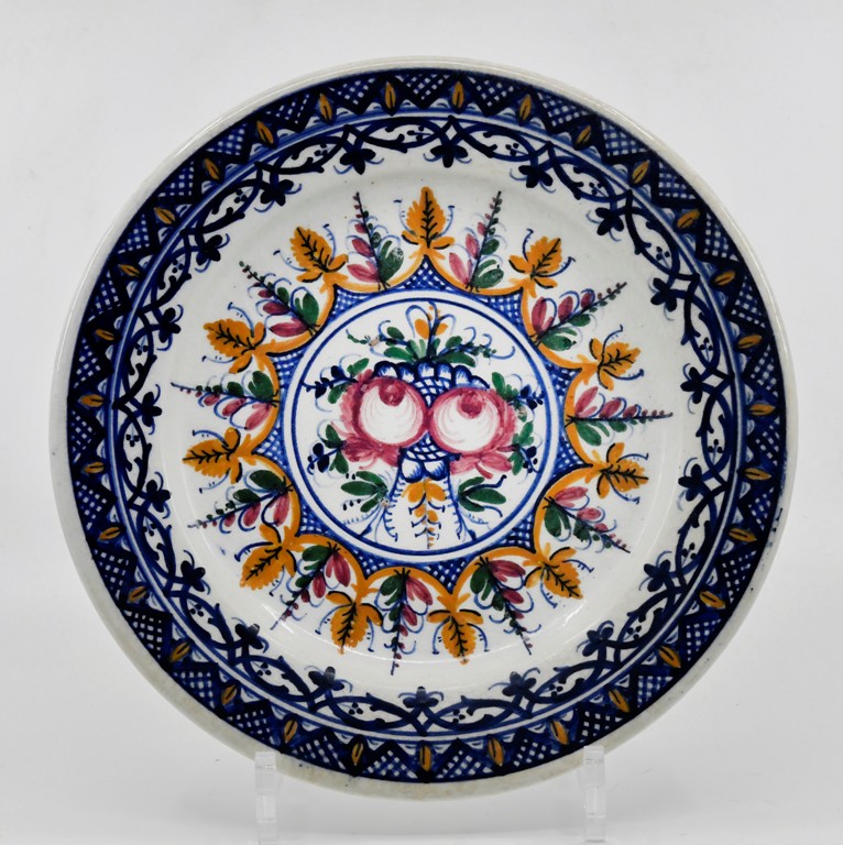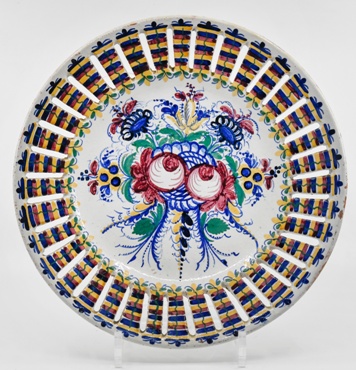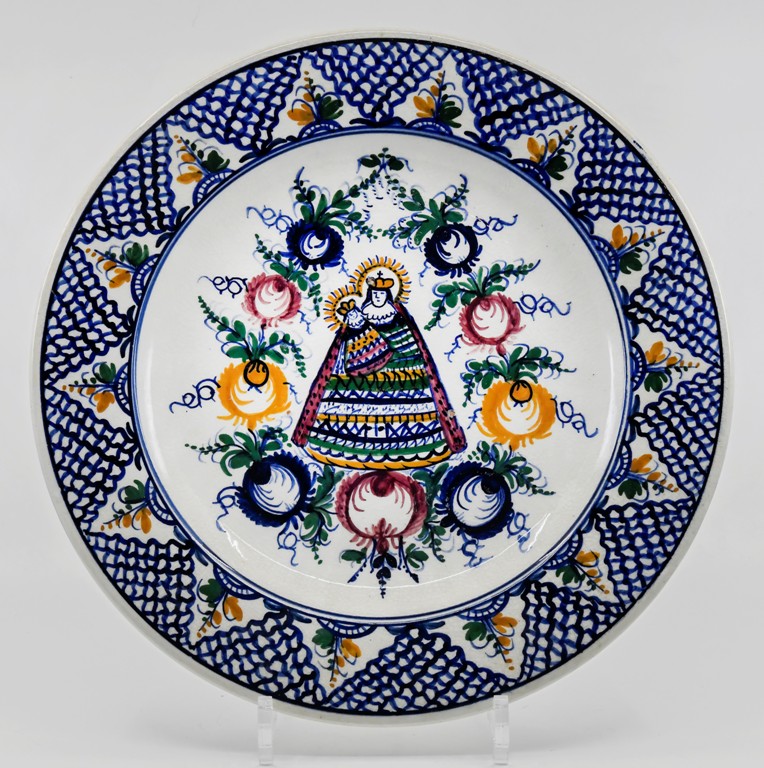 keramika bíle glazovaná, ručně malovaná barevným folklórním květinovým dekorem, v centrální částí stylizovaný motiv Madony, značeno monogramem K.S.V. (KAREL SKALICKÝ VYŠKOV). První polovina minulého století. Drobná poškození glazury.