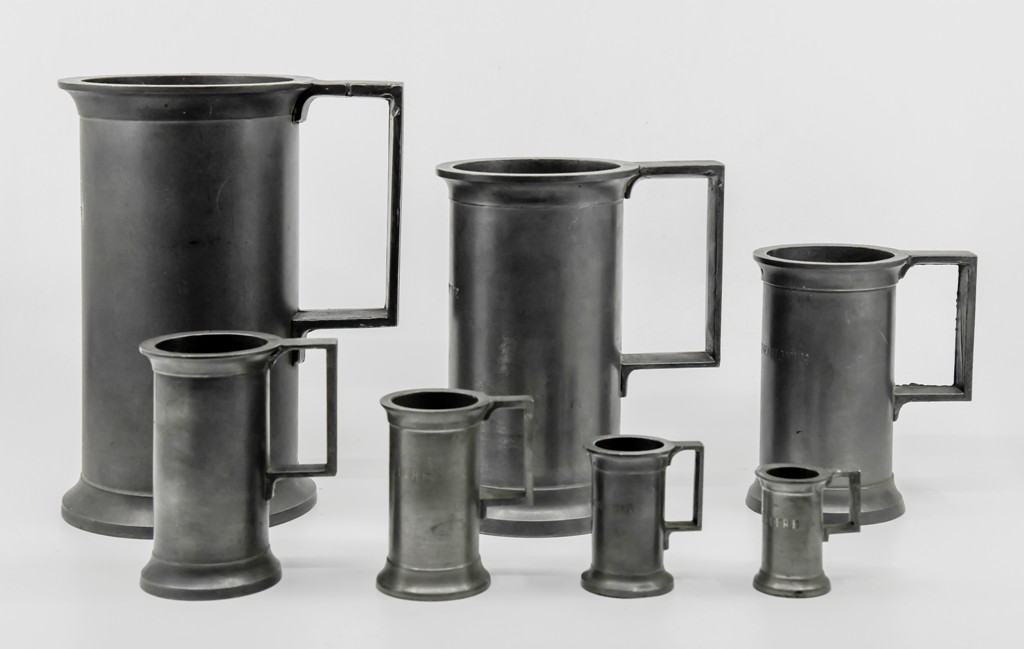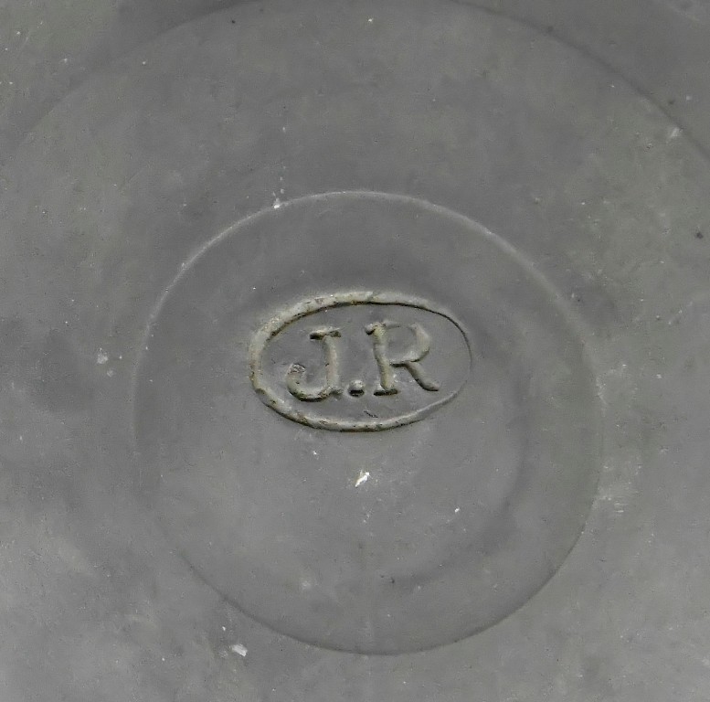 na každém uvedena míra, pět značeno vespod J.R, dva značeny ETAIN 97%, FRANCE, erbem a symbolem výrobku určeného pro styk s potravinami (sklenice a vidlička), každý u okraje opatřen cejchem.