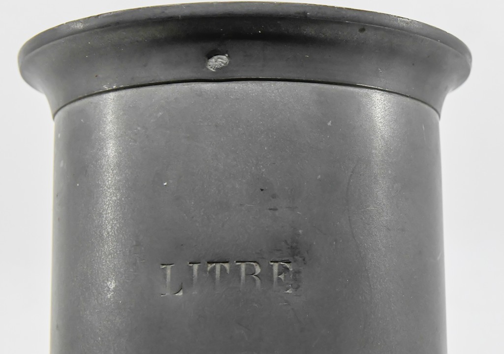 Na jednotlivých odměrkách uvedeny tyto míry: CENTILITRE, DOUBLE CENTILITRE, DEMI-DECILITRE, DECILITRE, DOUBLE-DECILITRE, DEMI LITRE, LITRE