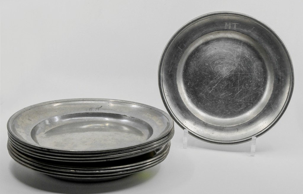 cín, všechny talíře vespod různě značeny, na jednom monogram MT, na čtyřech psacím A.T, další 4 bez monogramu. 19. století, dobrý stav.