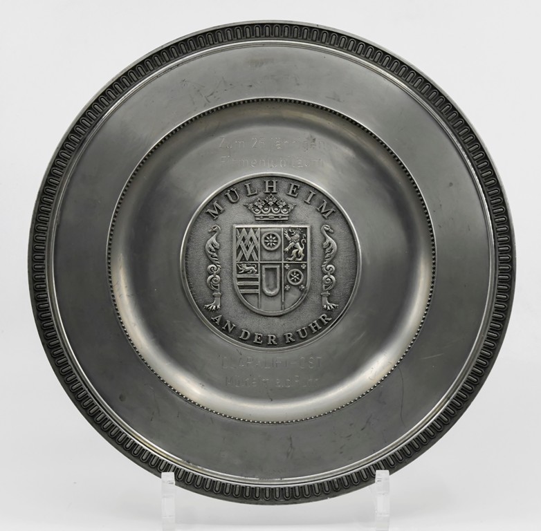 cín, ve dně plastický znak města MÜLHEIM an der RUHR a vyrytý text "Zur 25 Jähringem Firmen Jubiläum CLARKLIFT-OST Mülheim a.d. Ruhr". Vespod cínařská značka.