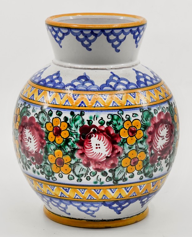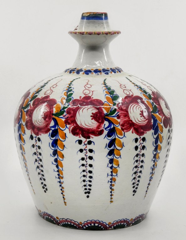 keramika bíle glazovaná, ručně malovaná barevným folklórním květinovým dekorem, značeno monogramem K.S.V. (KAREL SKALICKÝ VYŠKOV), první polovina minulého století. Drobná poškození glazury.