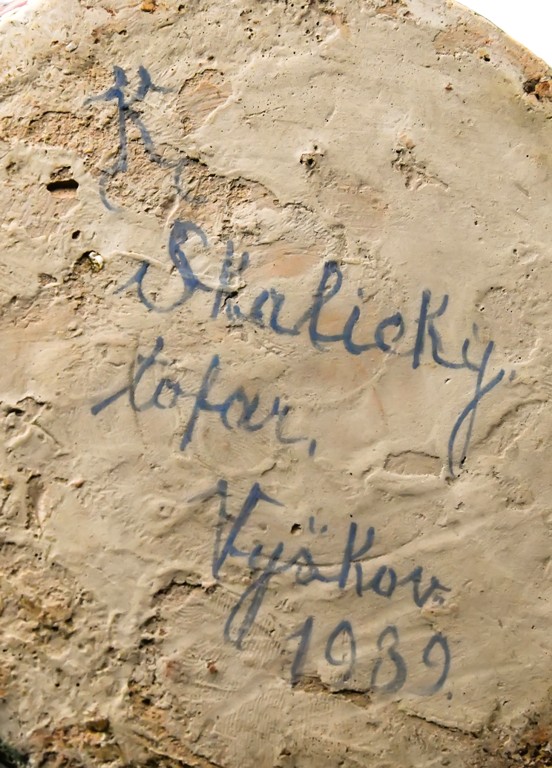 keramika glazovaná, barevně ručně malovaná motivem růží, značeno K. SKALICKÝ, tofar, Vyškov 1939. Na několika místech povrchová glazura poškozena.
