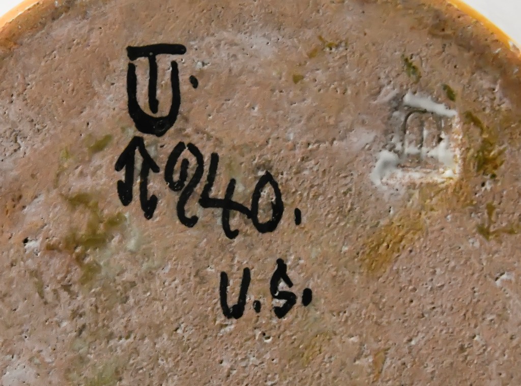 keramika bíle glazovaná, ručně malovaná barevnými folklorními květinovými ornamenty. ÚŘEDNÍČEK TUPESY, značeno vtlačeně TU a ručně TU 1940 U.S. Menší poškození povrchu glazury.